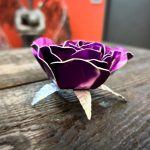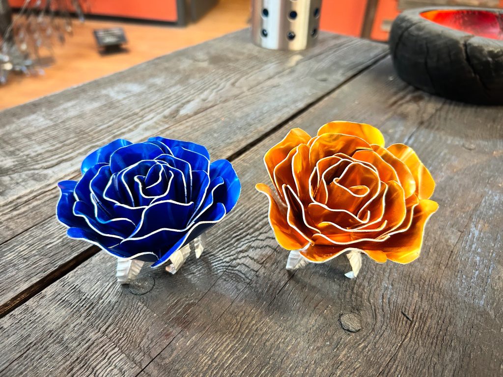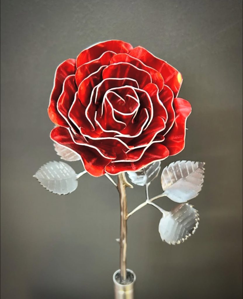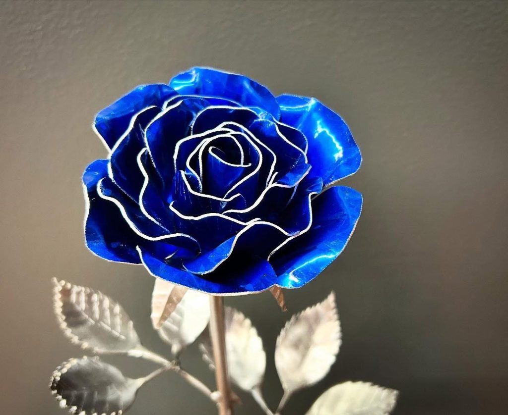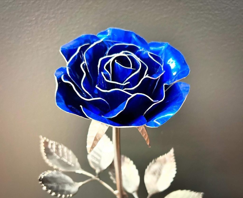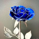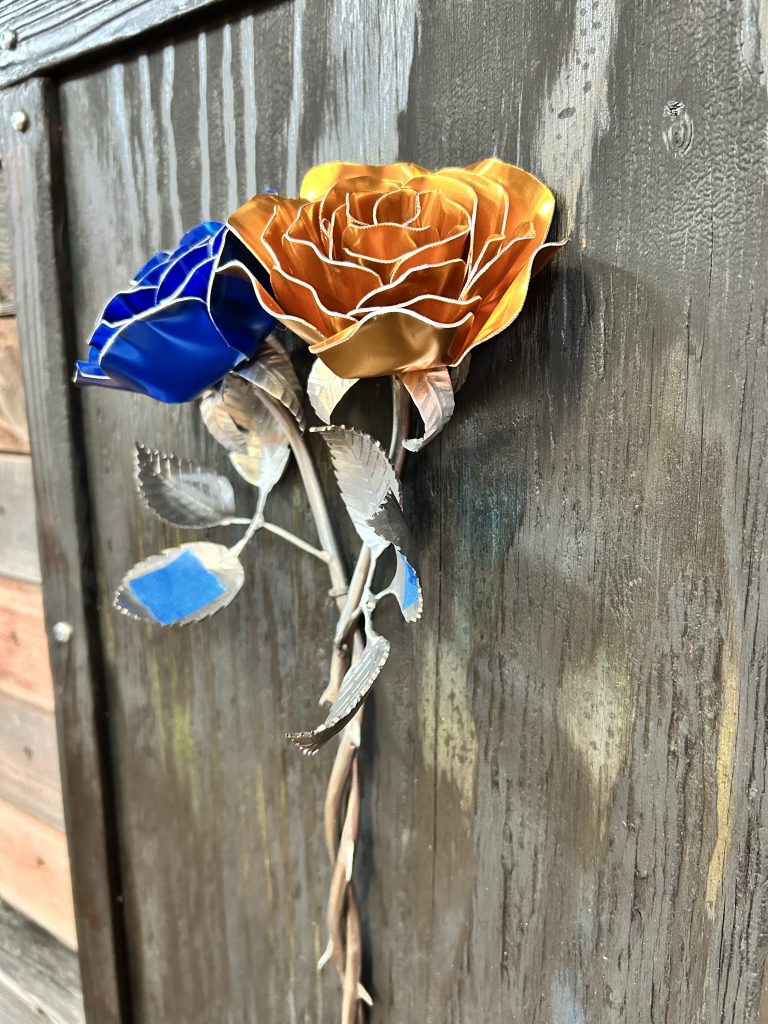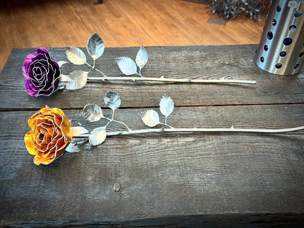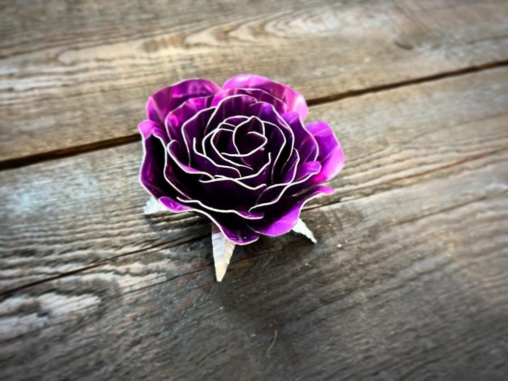 One of a kind anodized aluminum roses. To my knowledge not created by anyone else in the world. Attached to polished metal stems with leaves and thorns