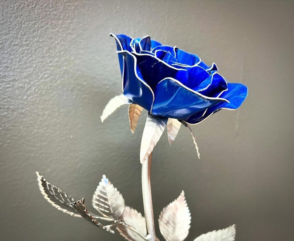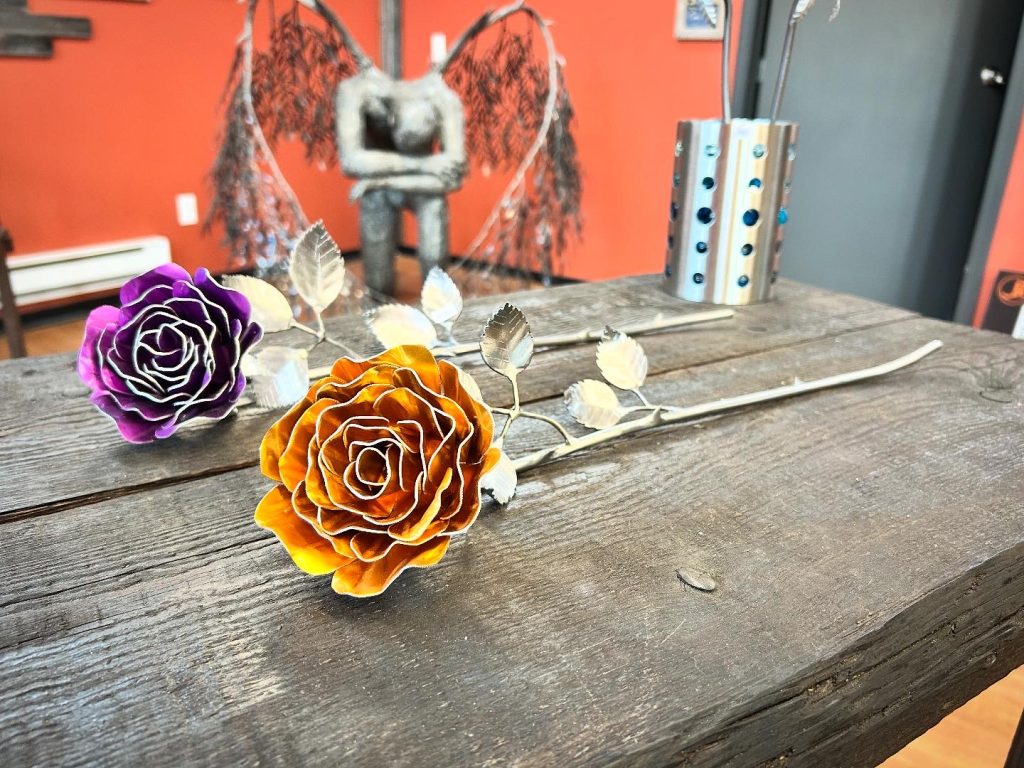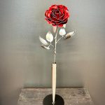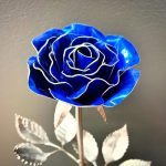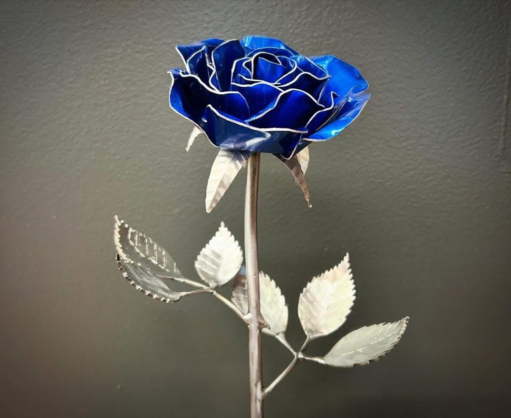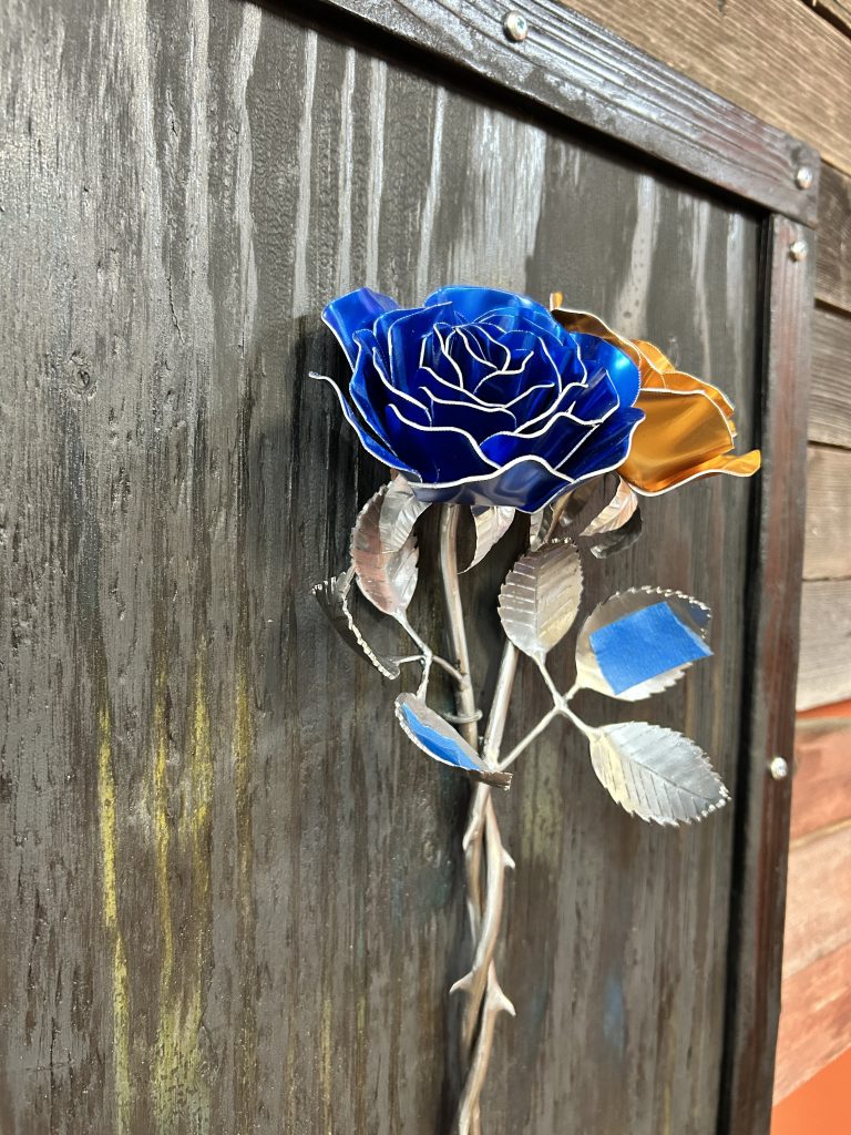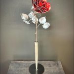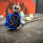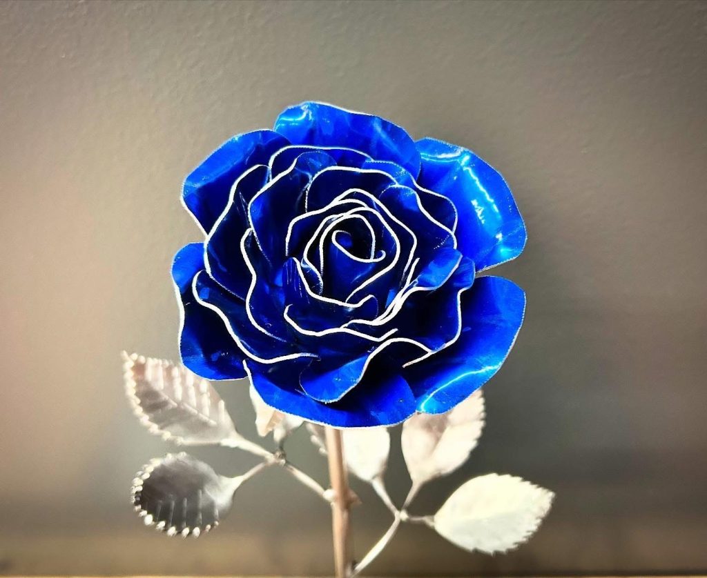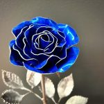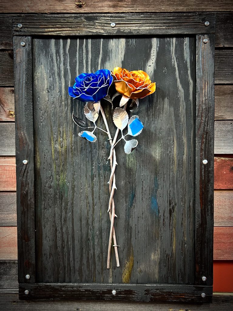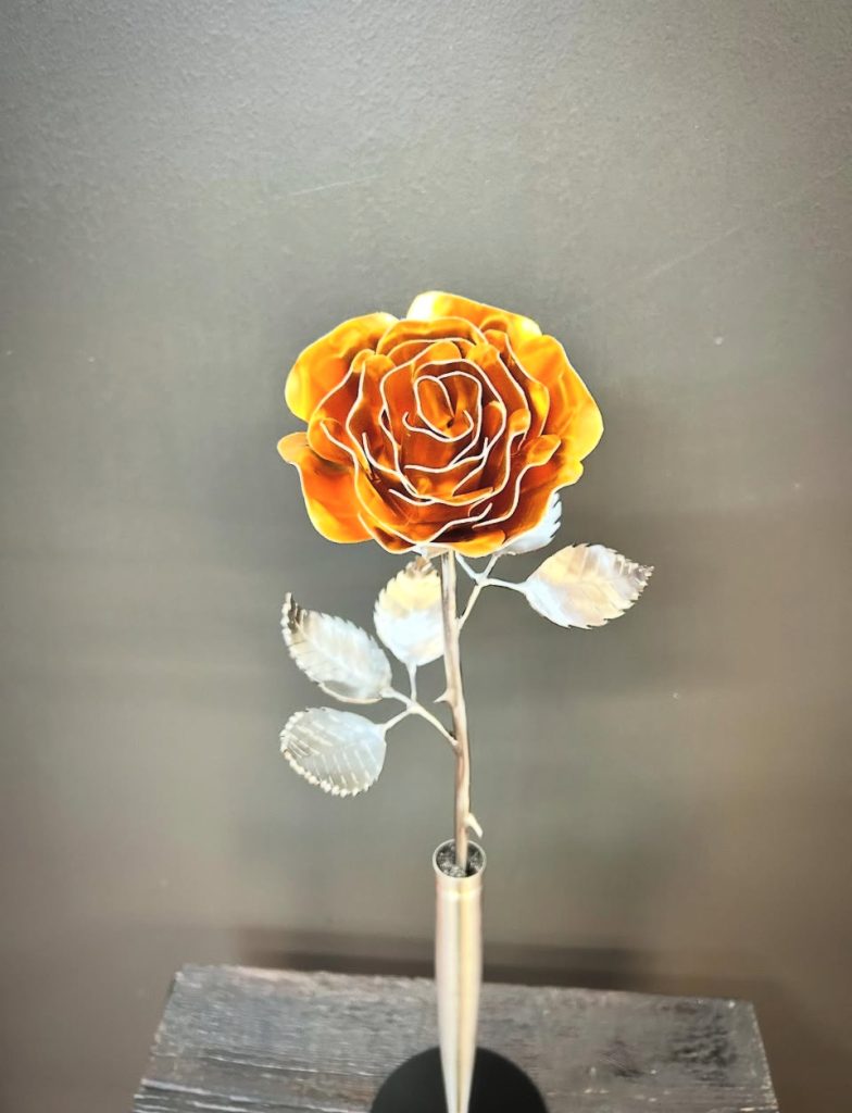 One of a kind anodized aluminum roses. To my knowledge not created by anyone else in the world. Attached to polished metal stems with leaves and thorns