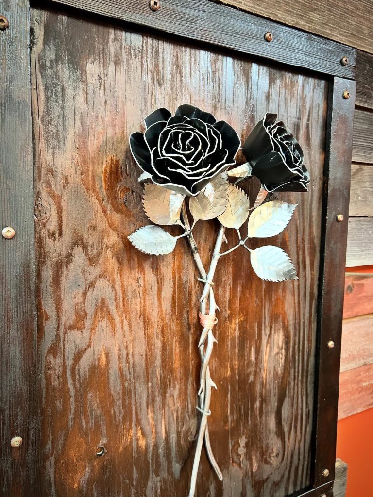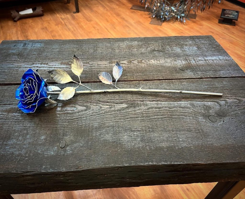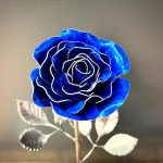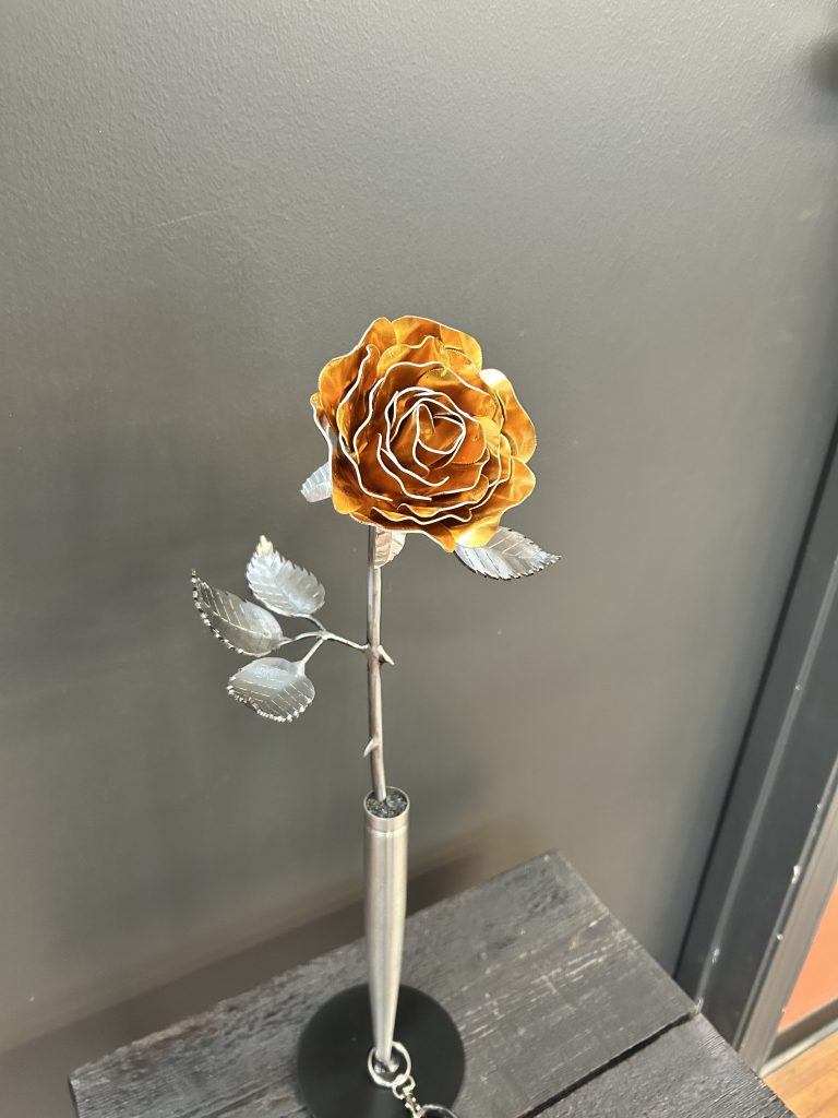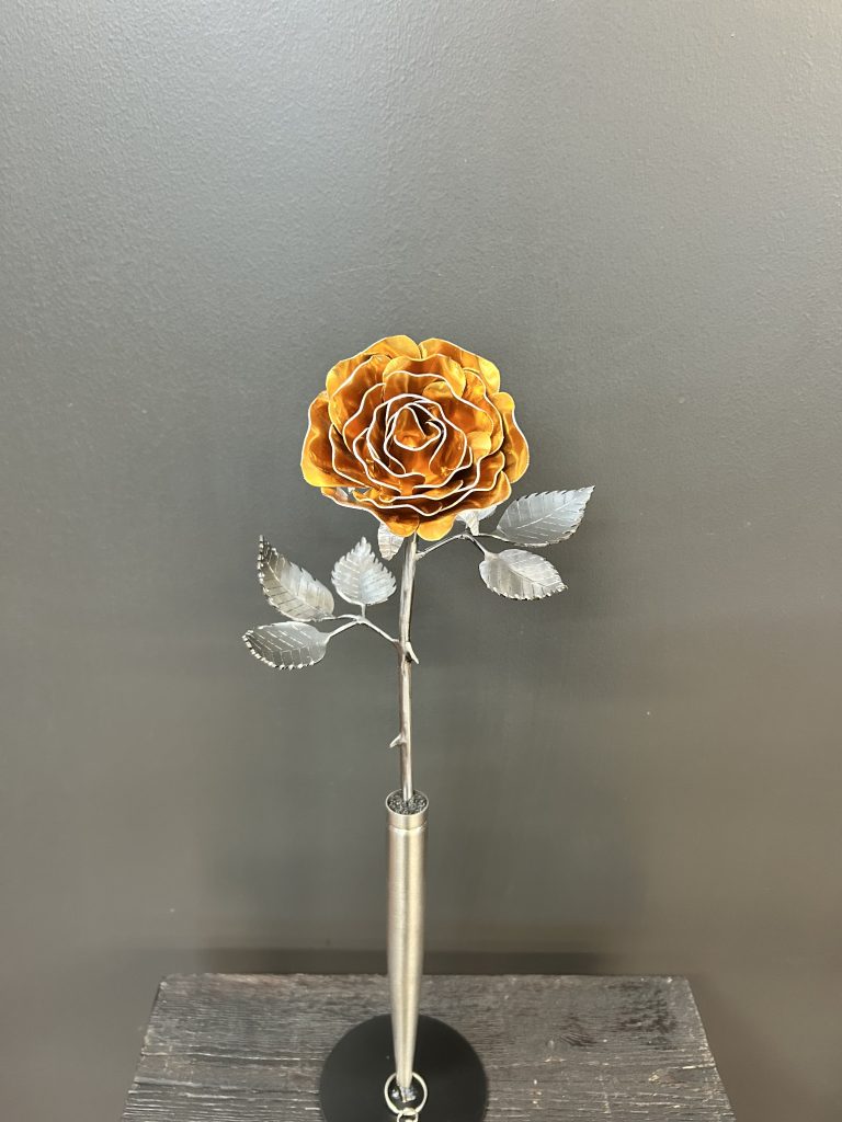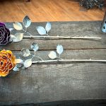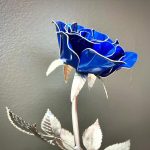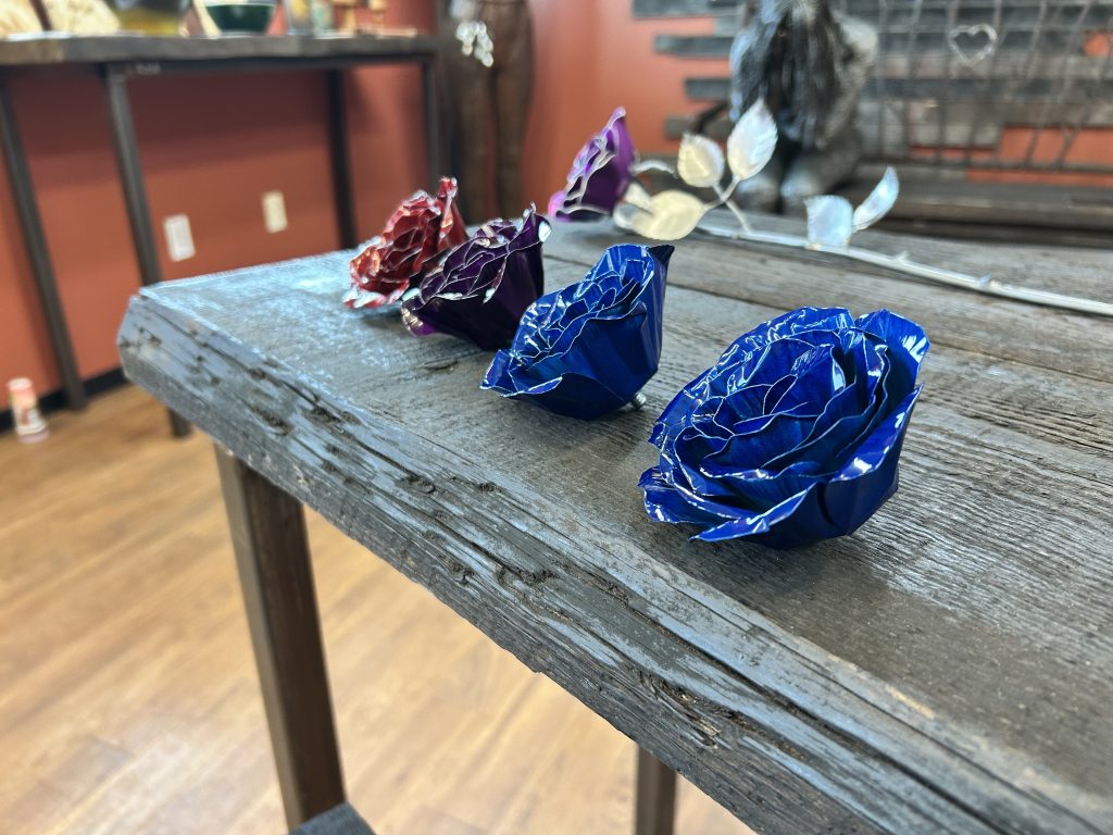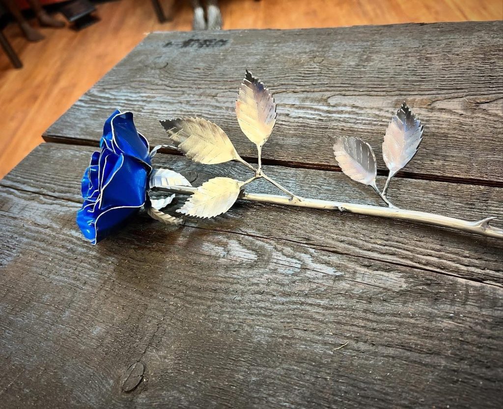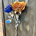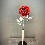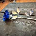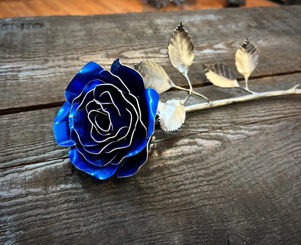 One of a kind anodized aluminum roses. To my knowledge not created by anyone else in the world. Attached to polished metal stems with leaves and thorns