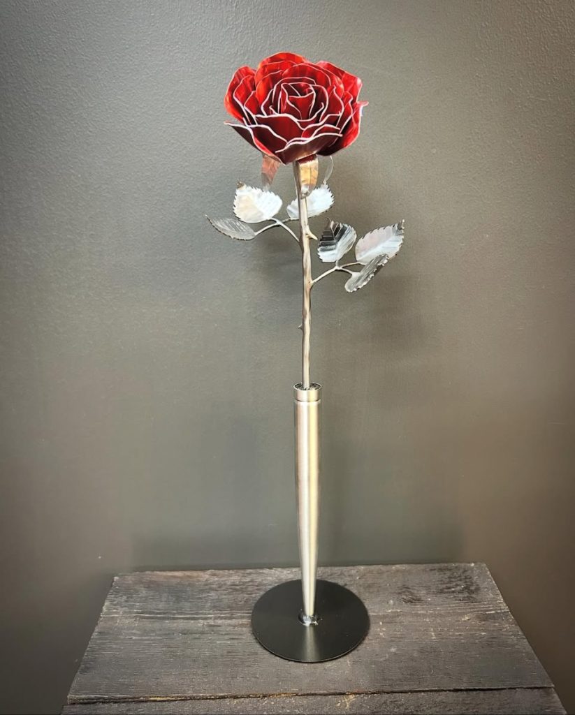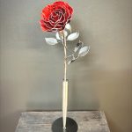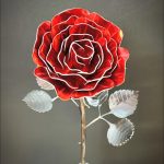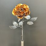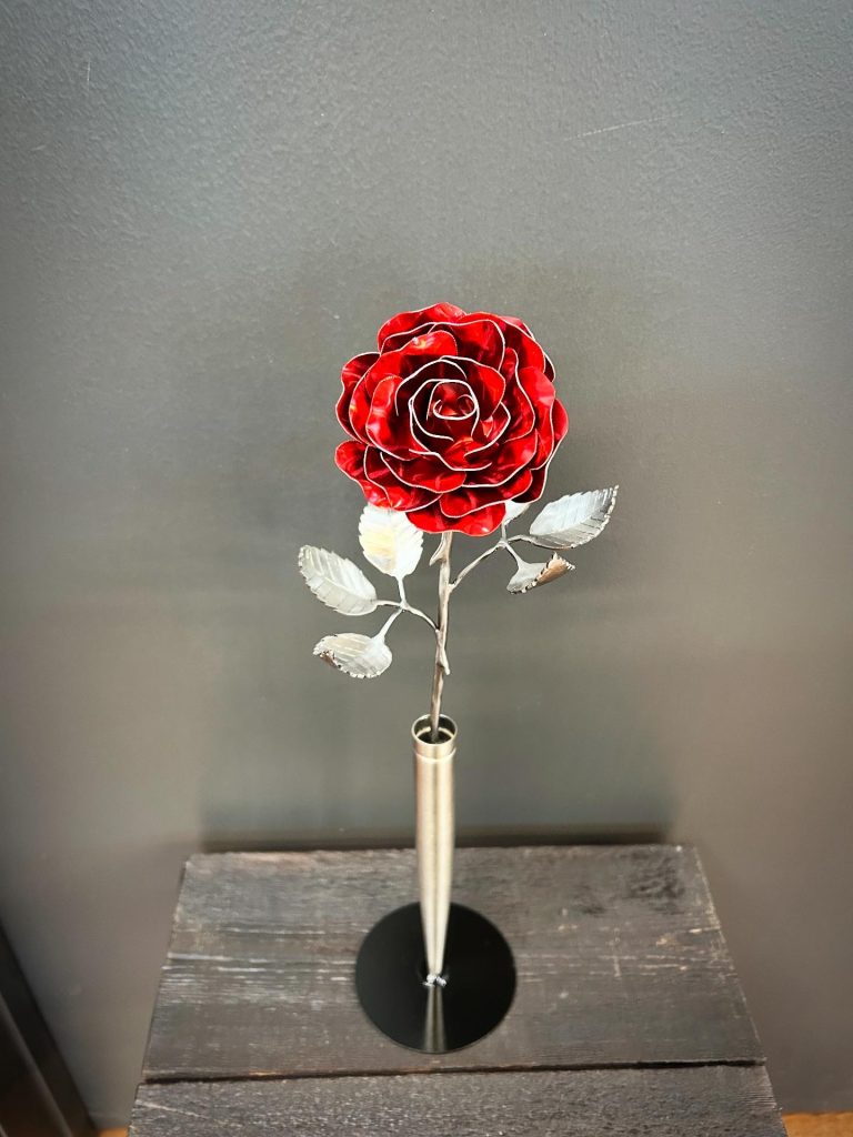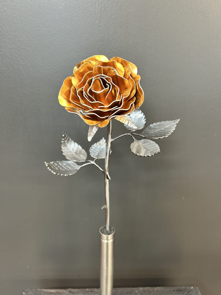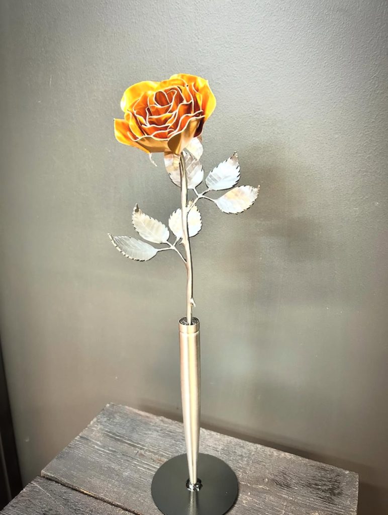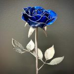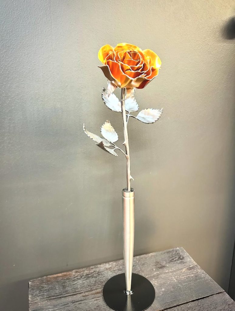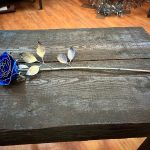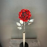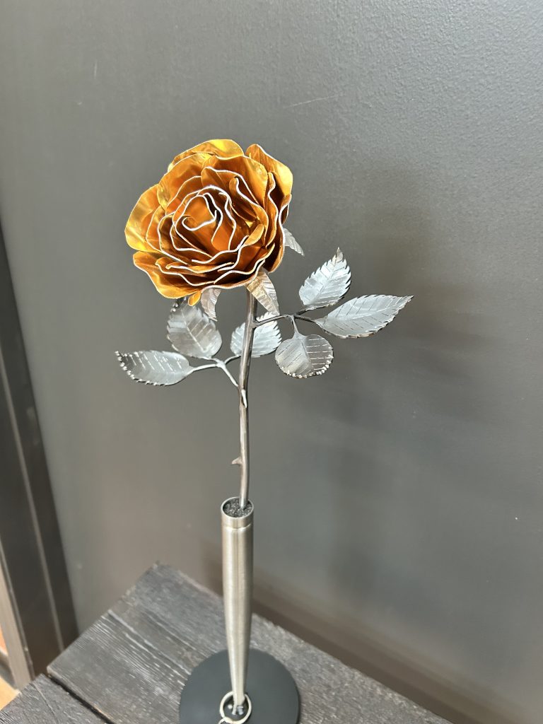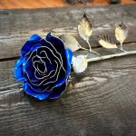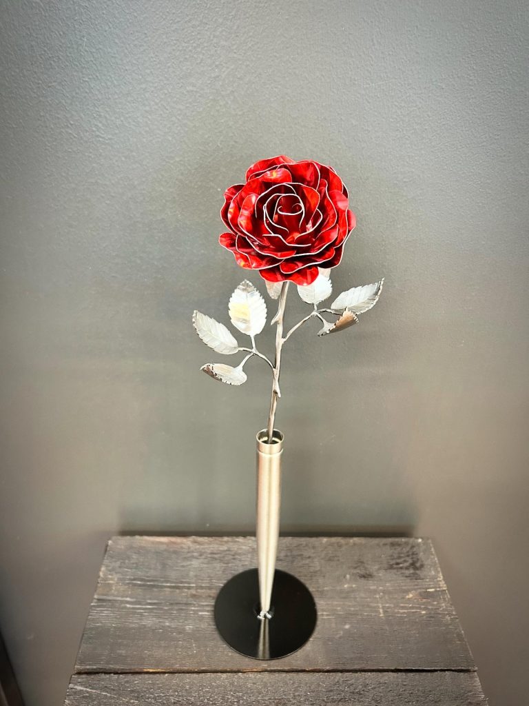 One of a kind anodized aluminum roses. To my knowledge not created by anyone else in the world. Attached to polished metal stems with leaves and thorns