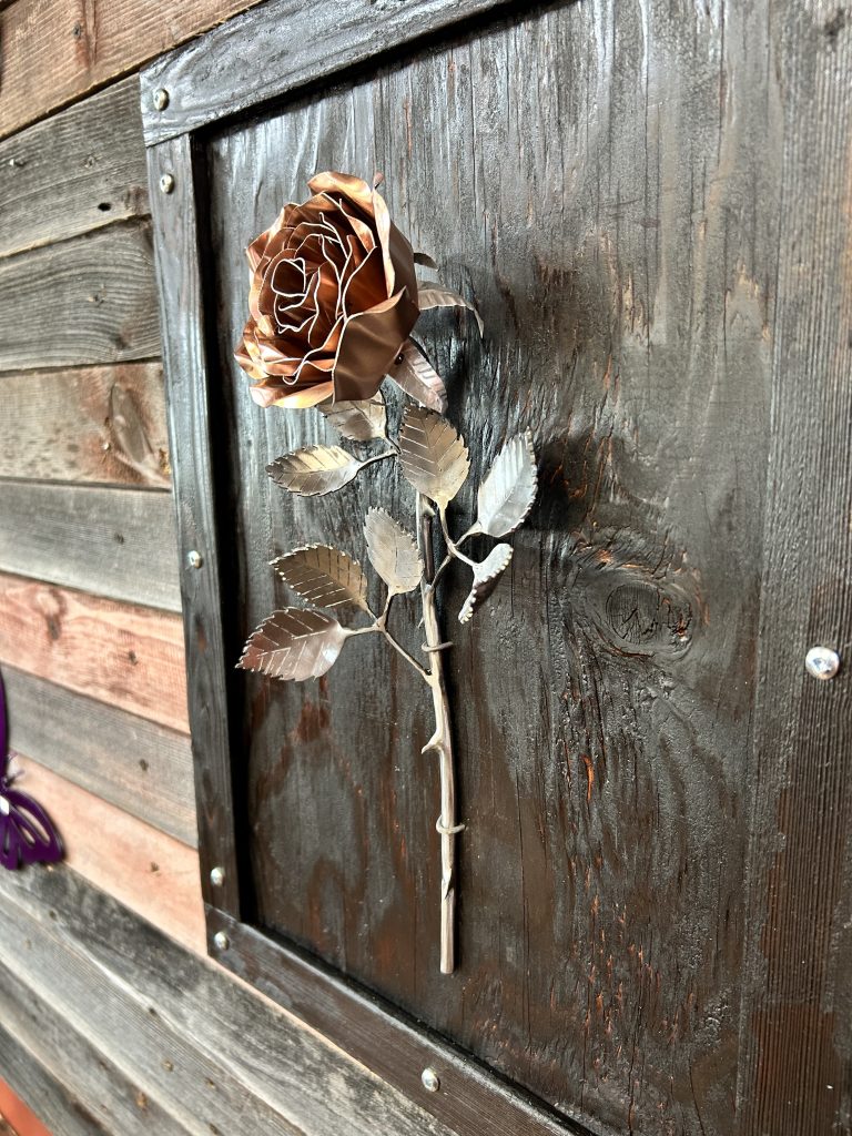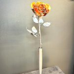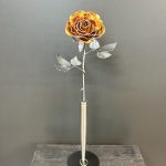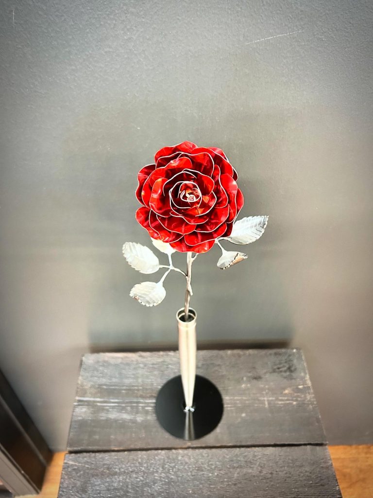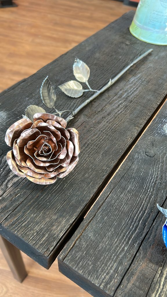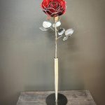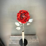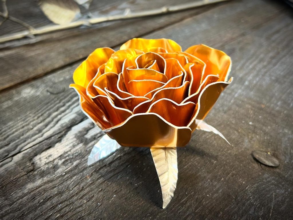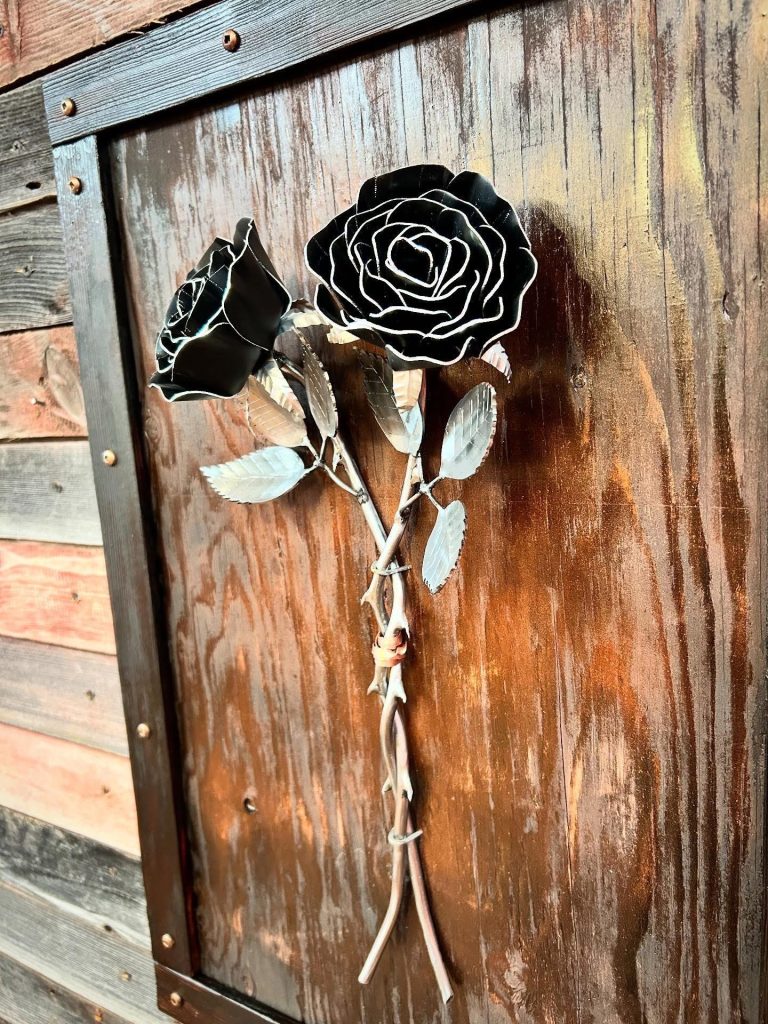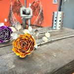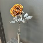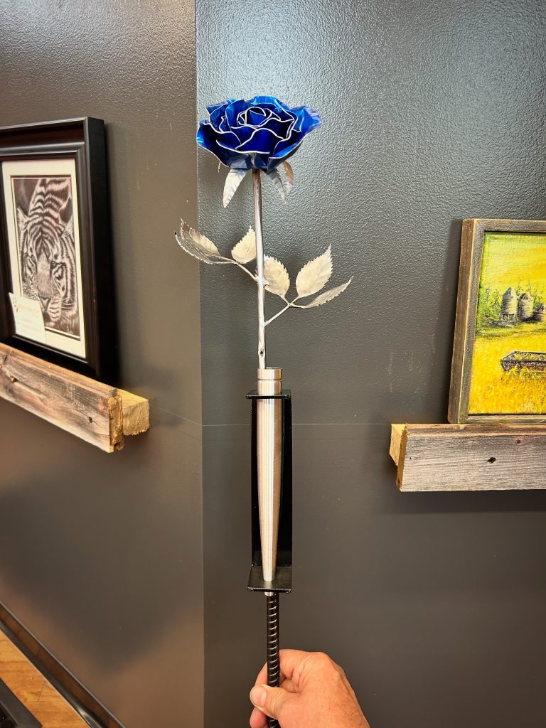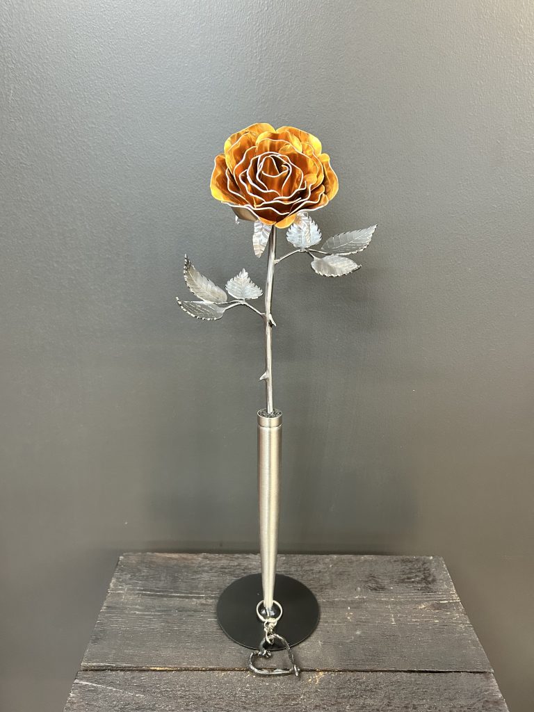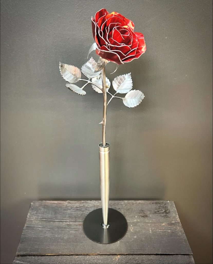 One of a kind anodized aluminum roses. To my knowledge not created by anyone else in the world. Attached to polished metal stems with leaves and thorns