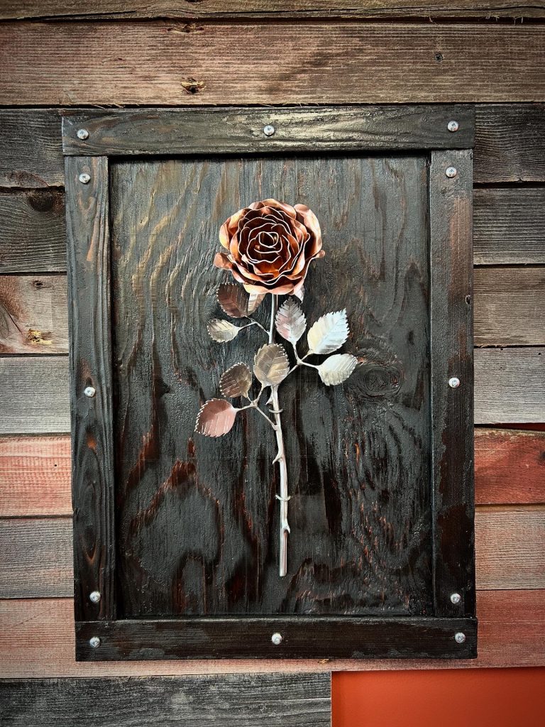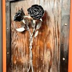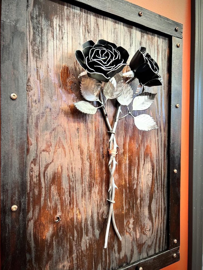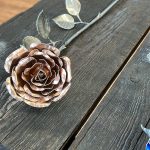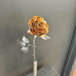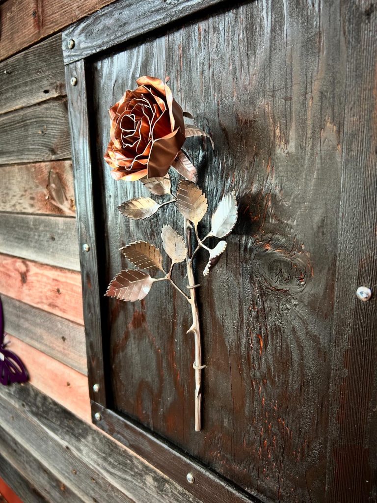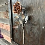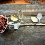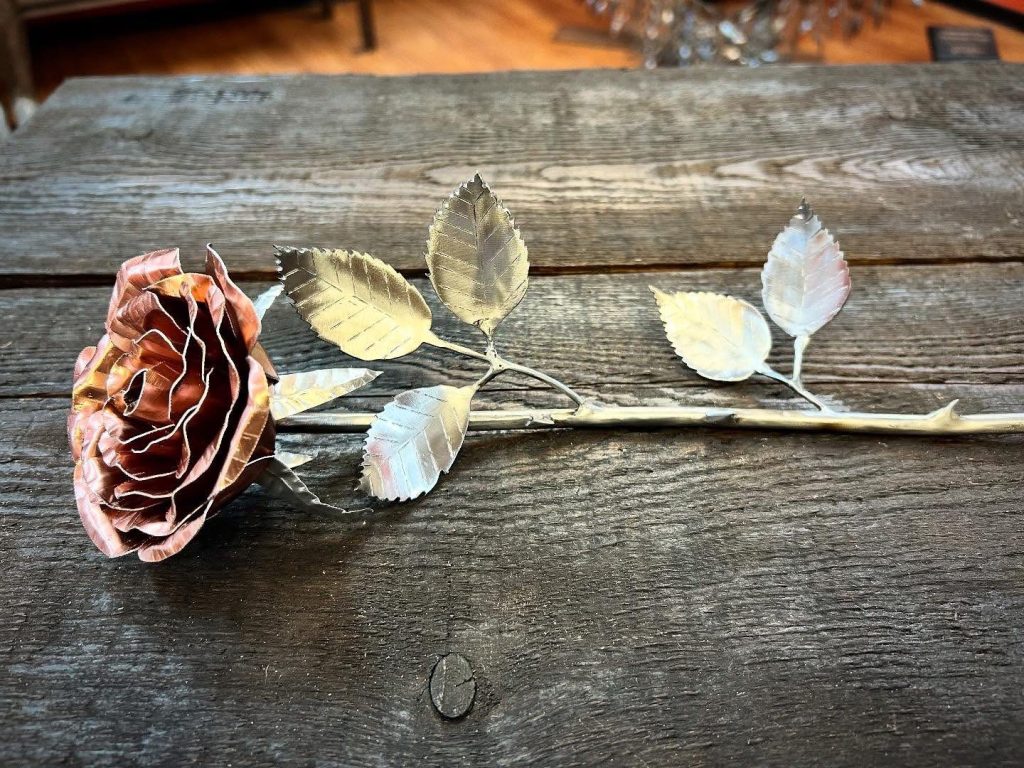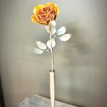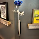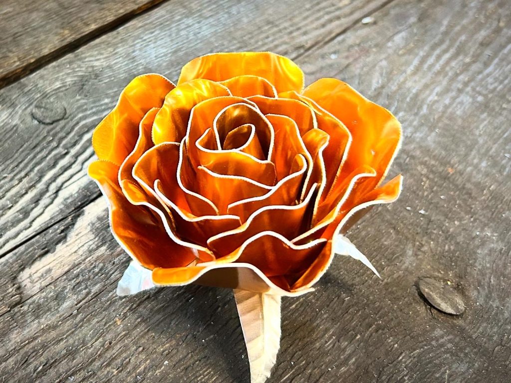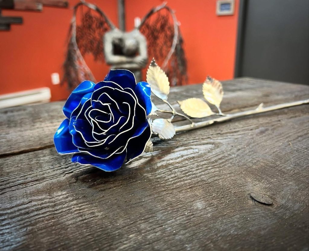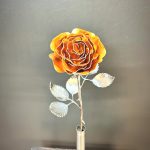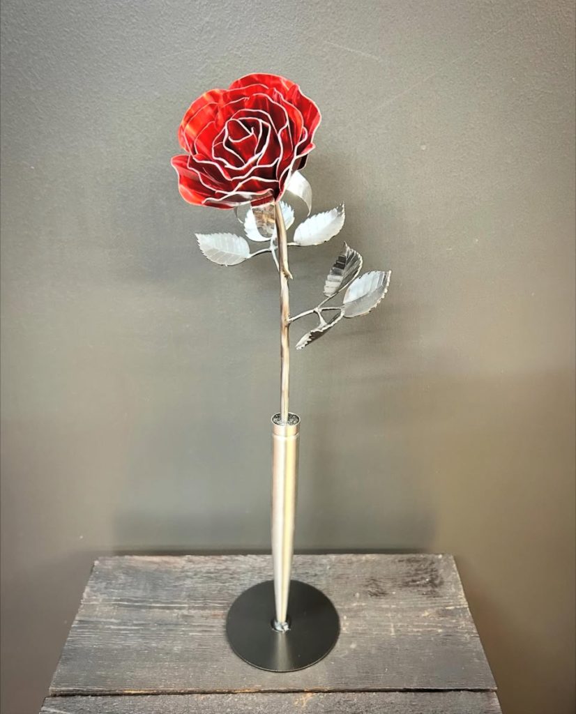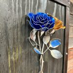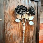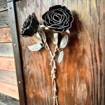 One of a kind anodized aluminum roses. To my knowledge not created by anyone else in the world. Attached to polished metal stems with leaves and thorns