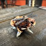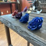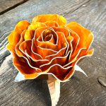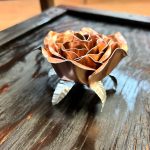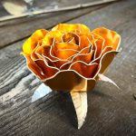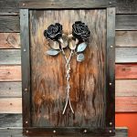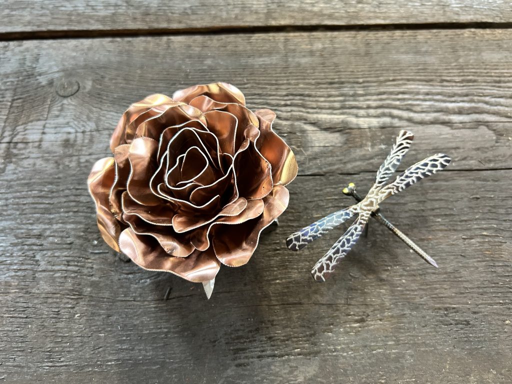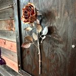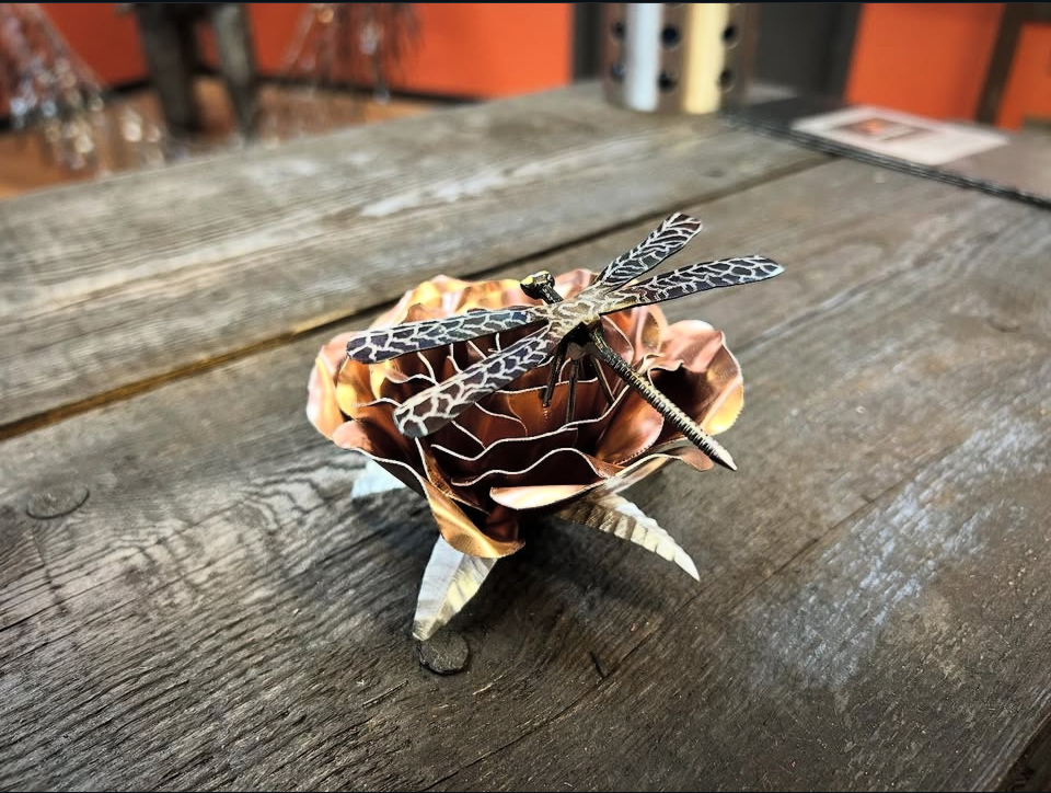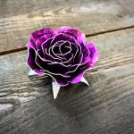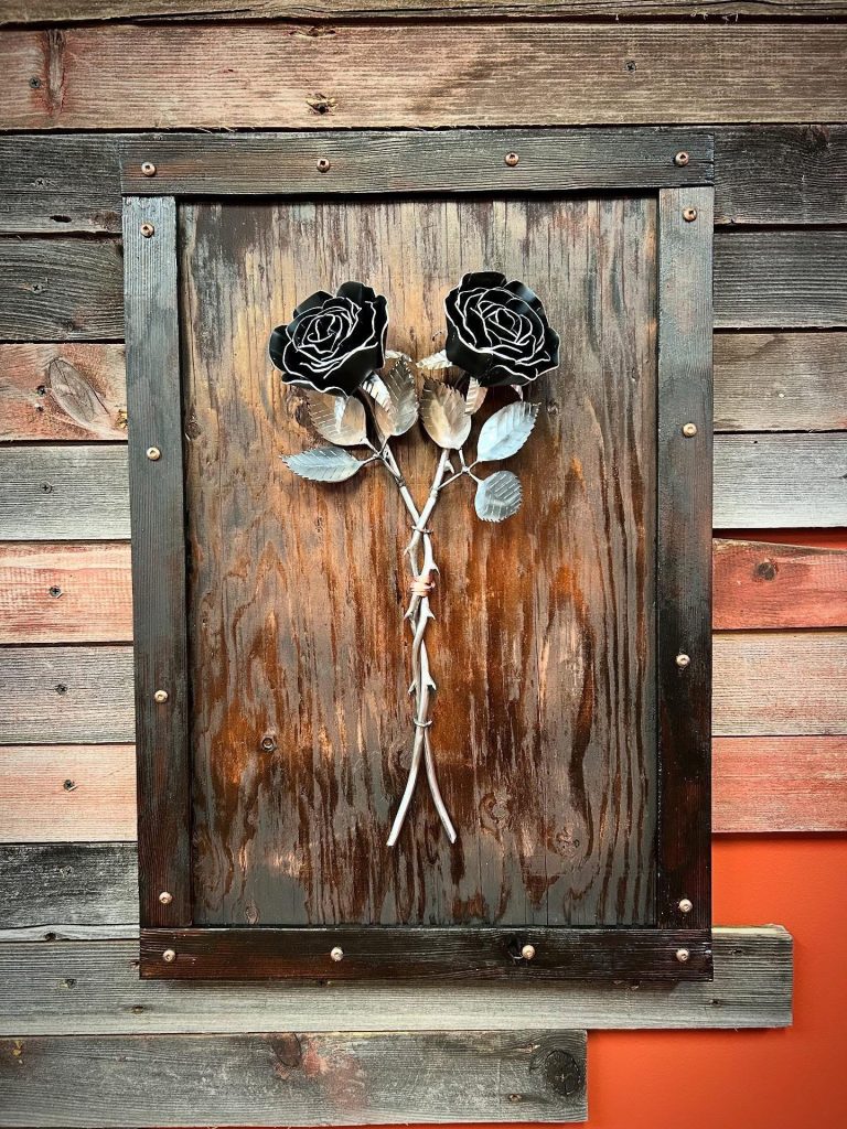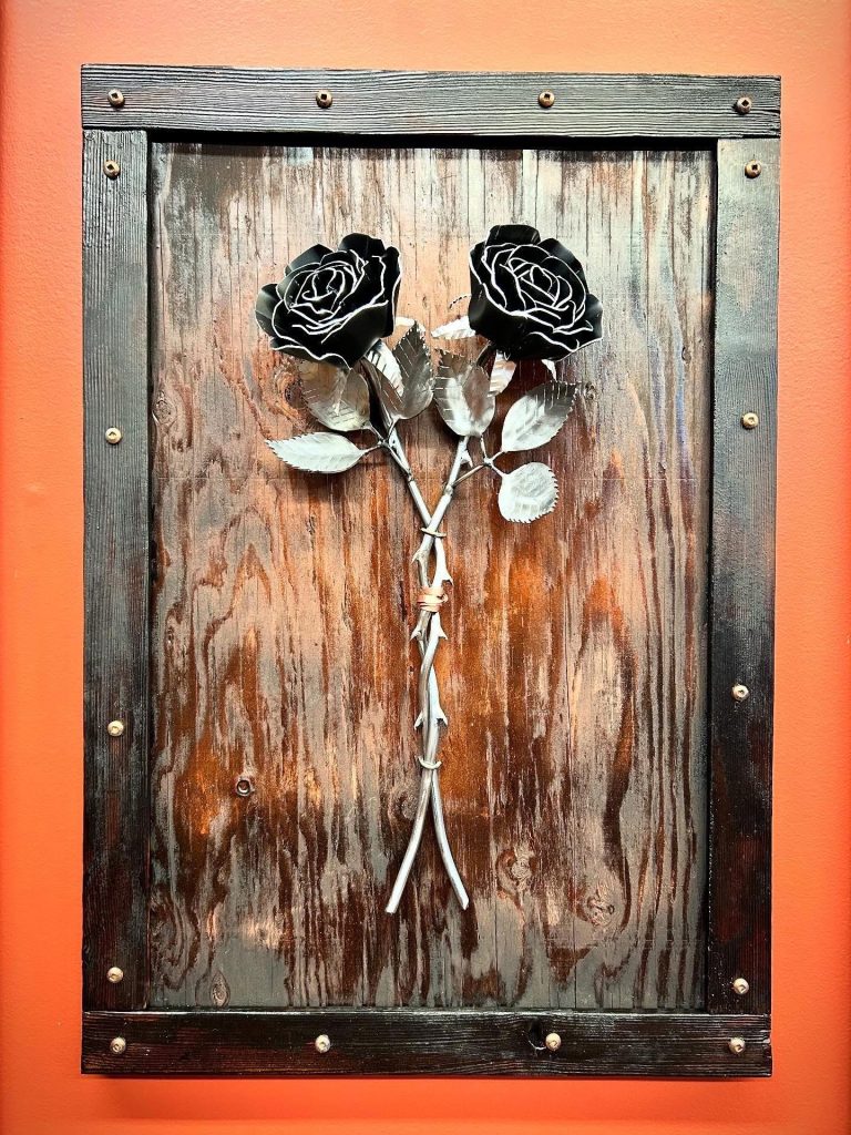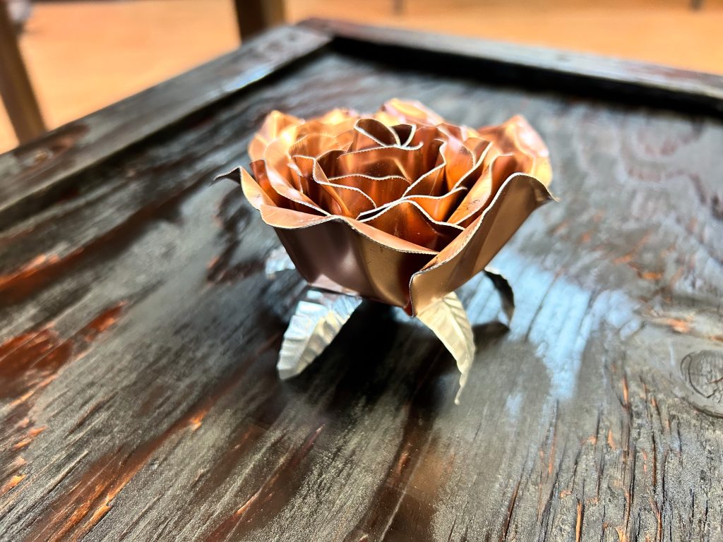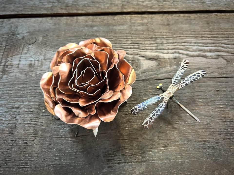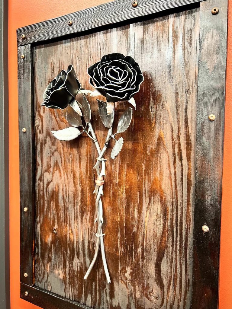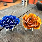 One of a kind anodized aluminum roses. To my knowledge not created by anyone else in the world. Attached to polished metal stems with leaves and thorns