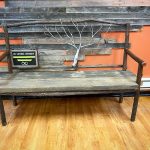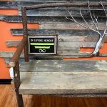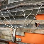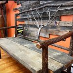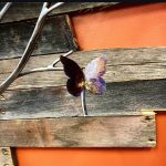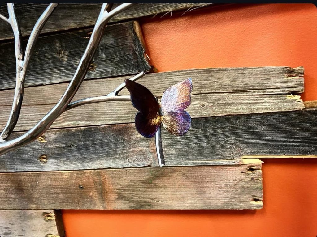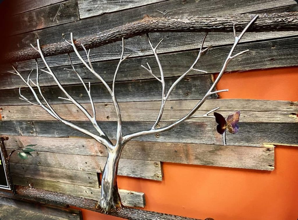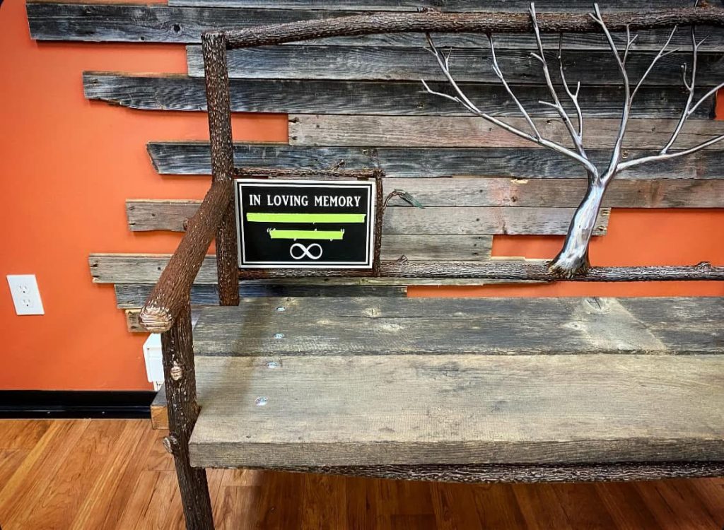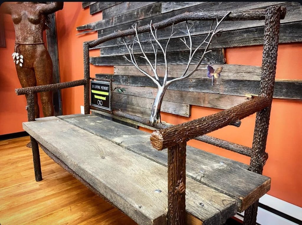 Memorial bench with a “family tree” on the back. A hole in the trunk to place messages. A butterfly on a broken branch .
