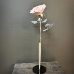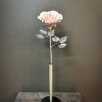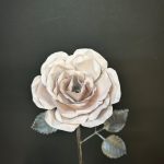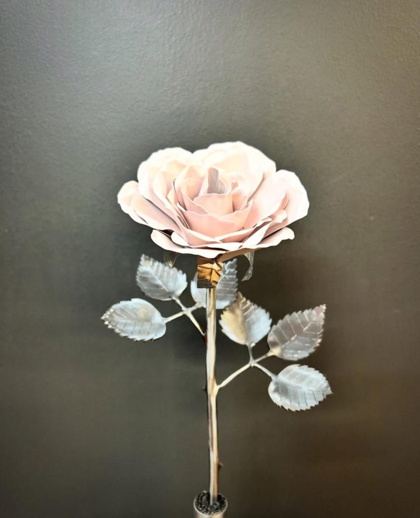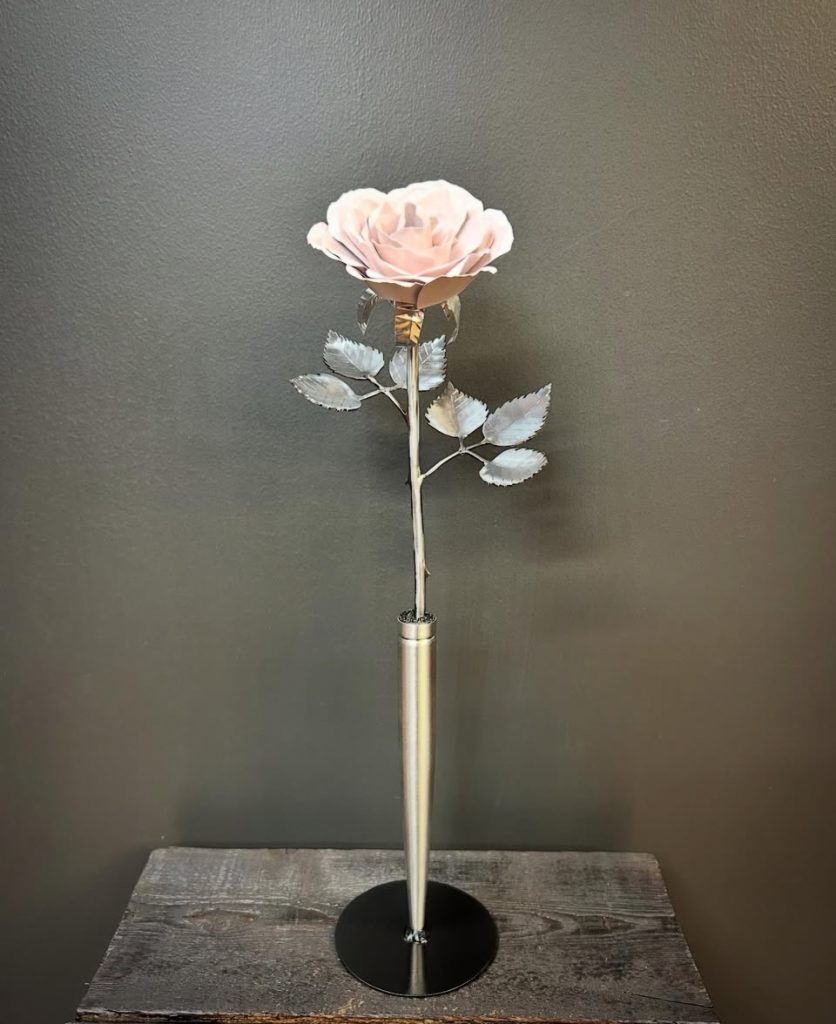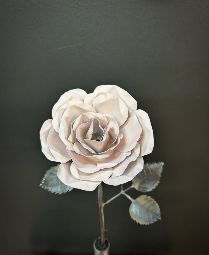 This rose is created from aluminum . Each layer individually primed and painted. Attached to steel stem and leaves .set in a stainless steel “vase” for elegant display.