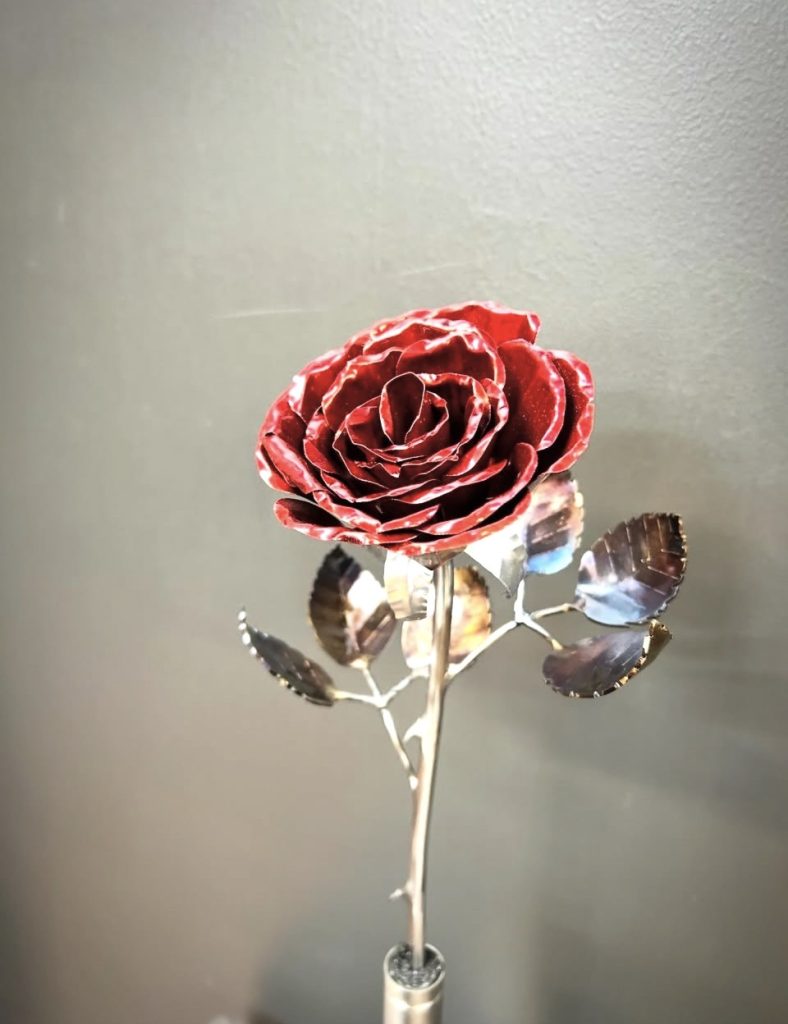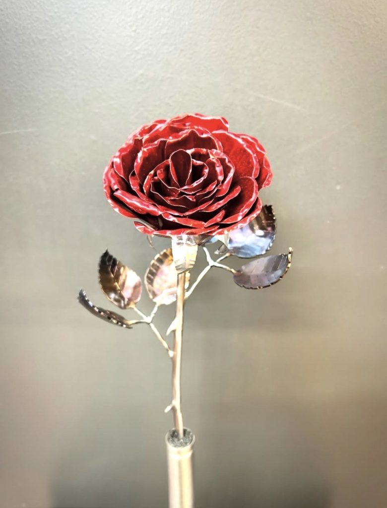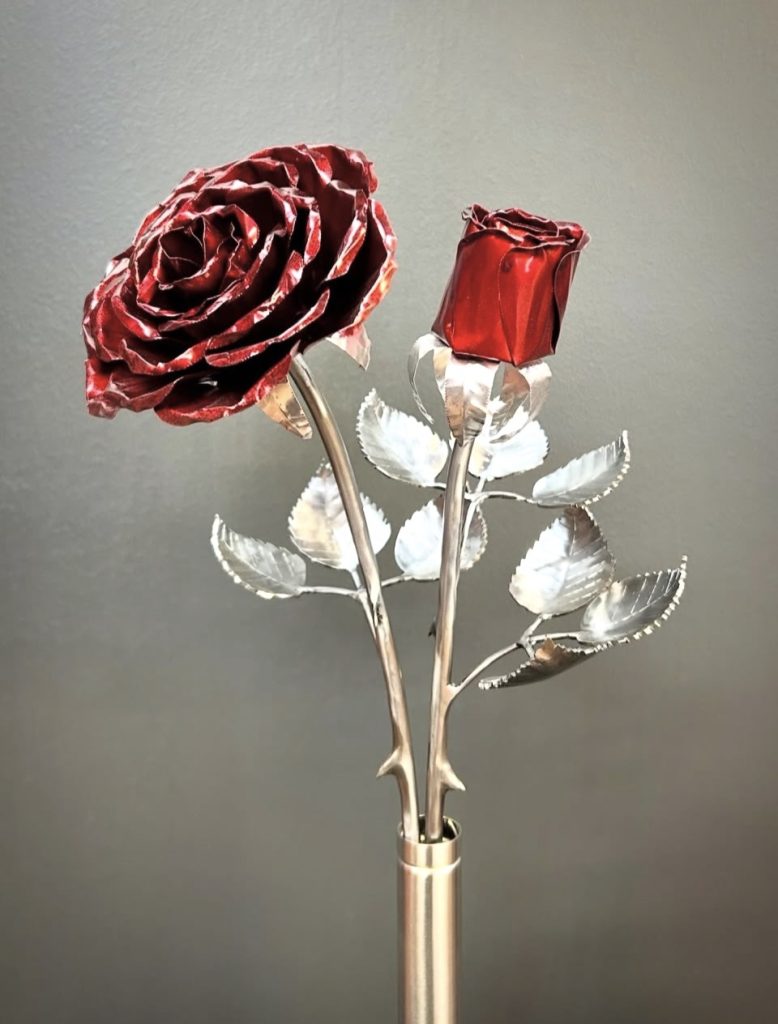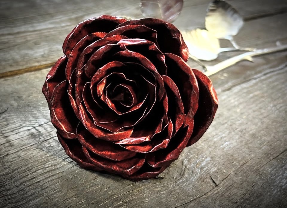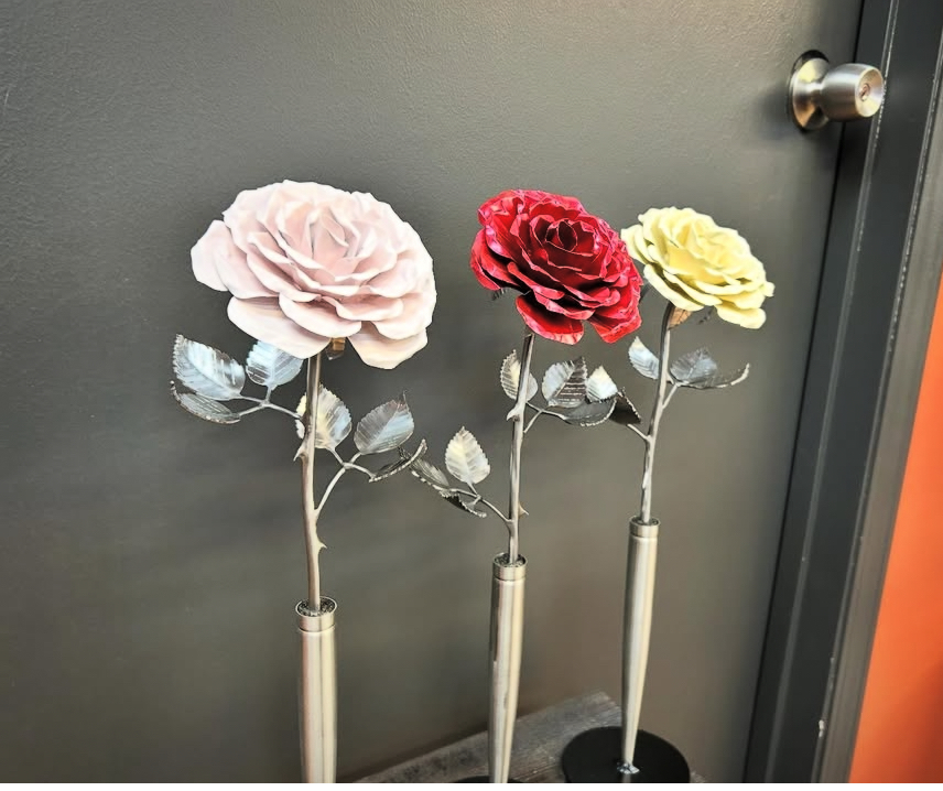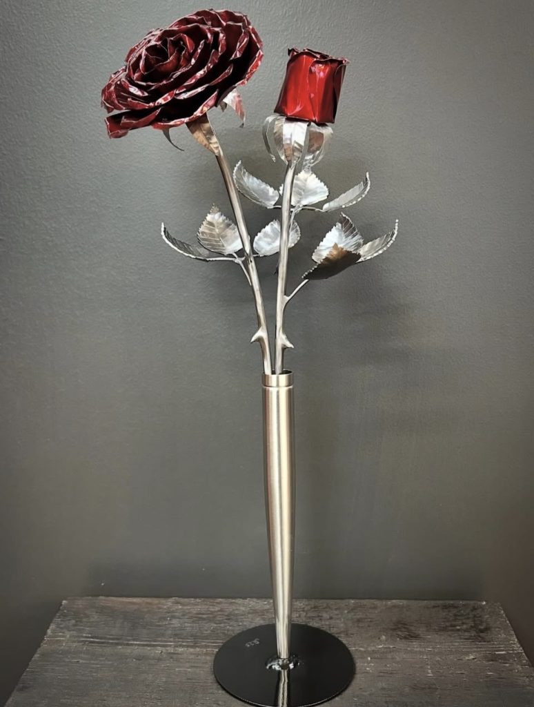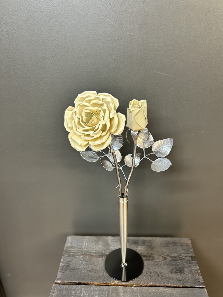 These roses are created from aluminum . Each layer individually primed and painted. Attached to steel stem and leaves .Set in a stainless steel “vase” for elegant display, on a burnt wood frame or simple laying on a surface display.