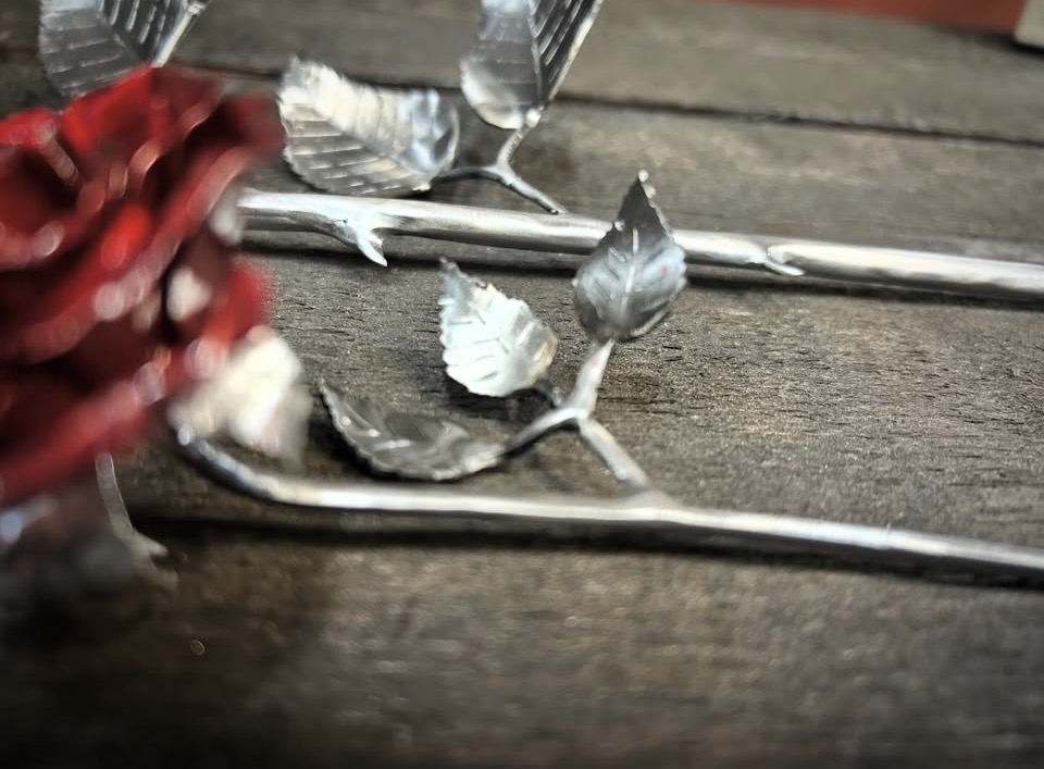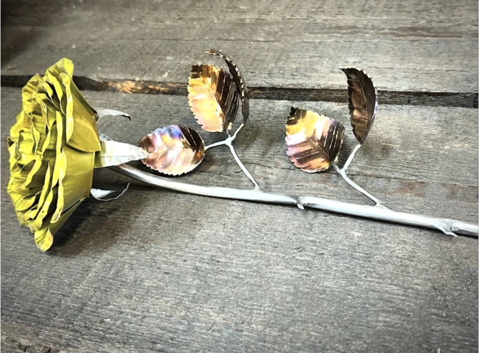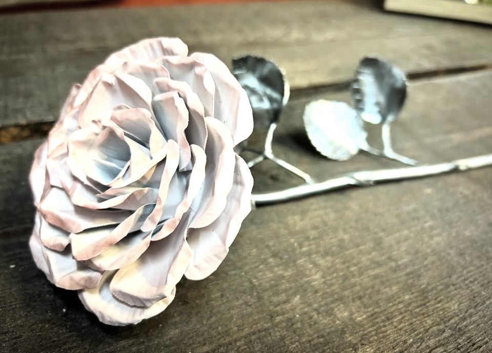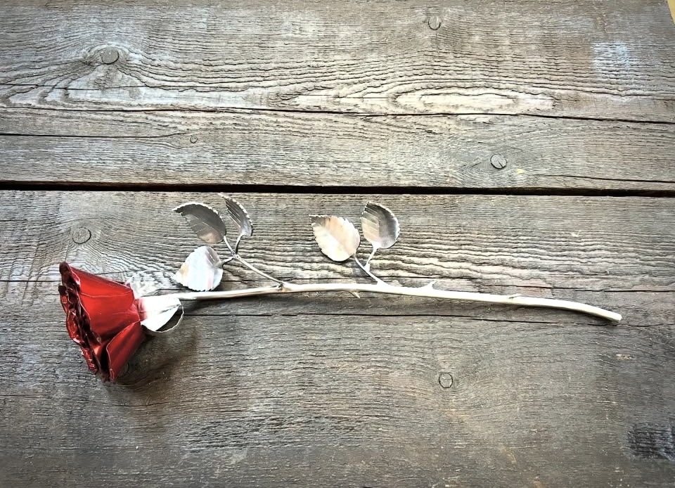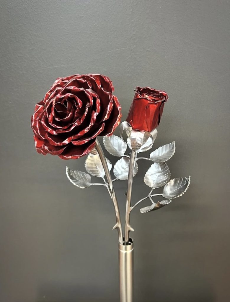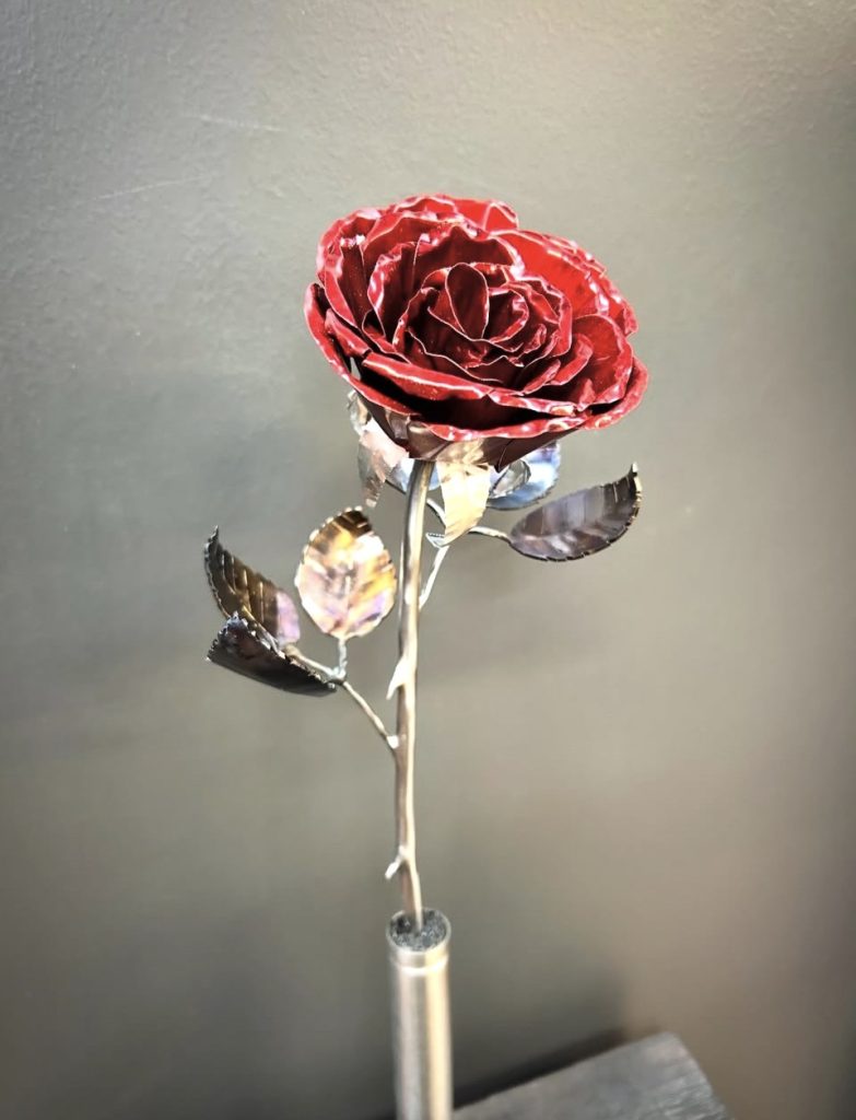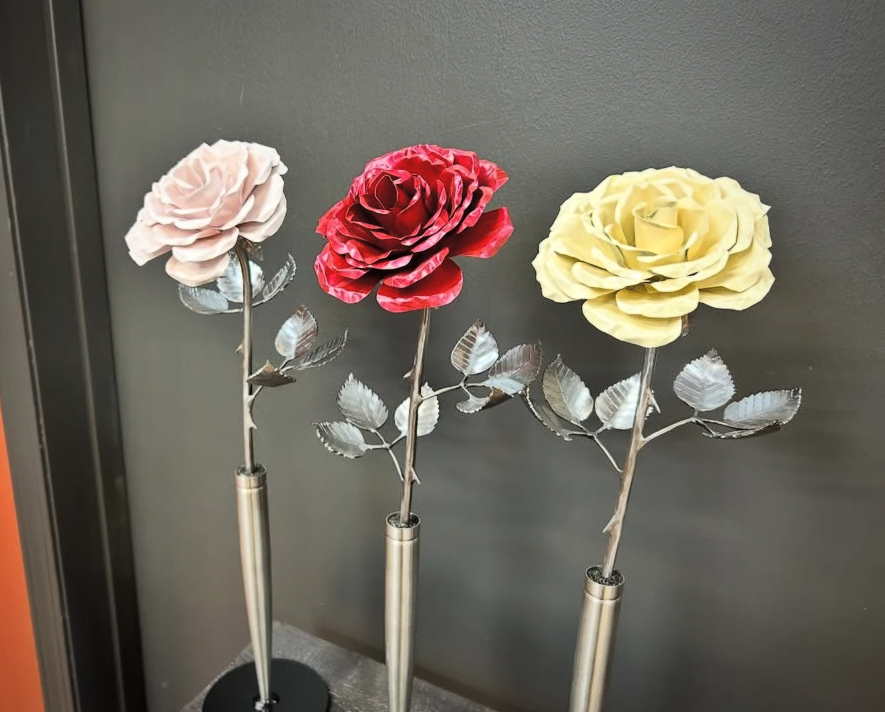 These roses are created from aluminum . Each layer individually primed and painted. Attached to steel stem and leaves .Set in a stainless steel “vase” for elegant display, on a burnt wood frame or simple laying on a surface display.