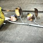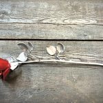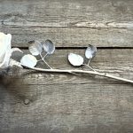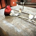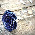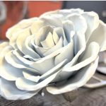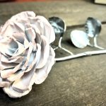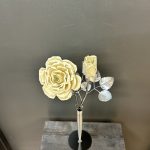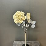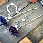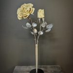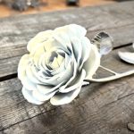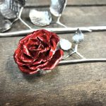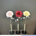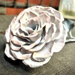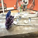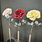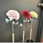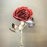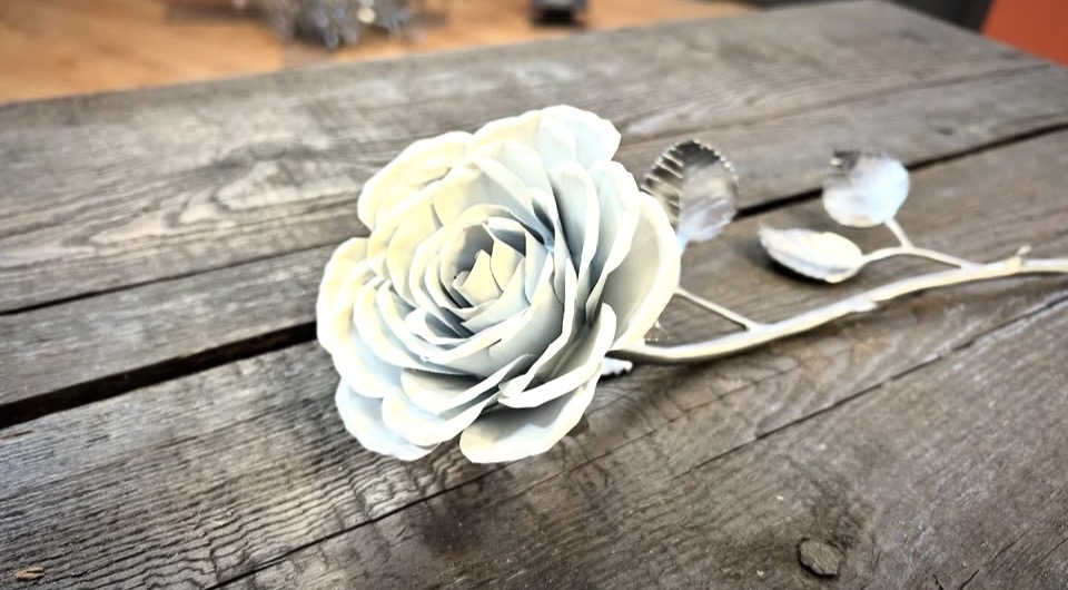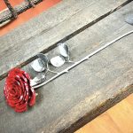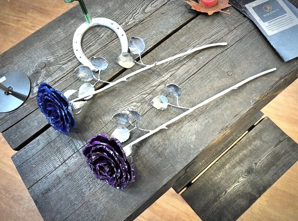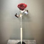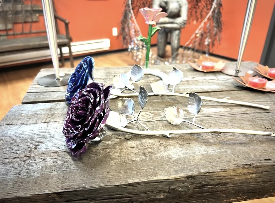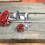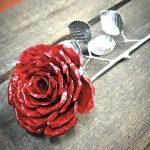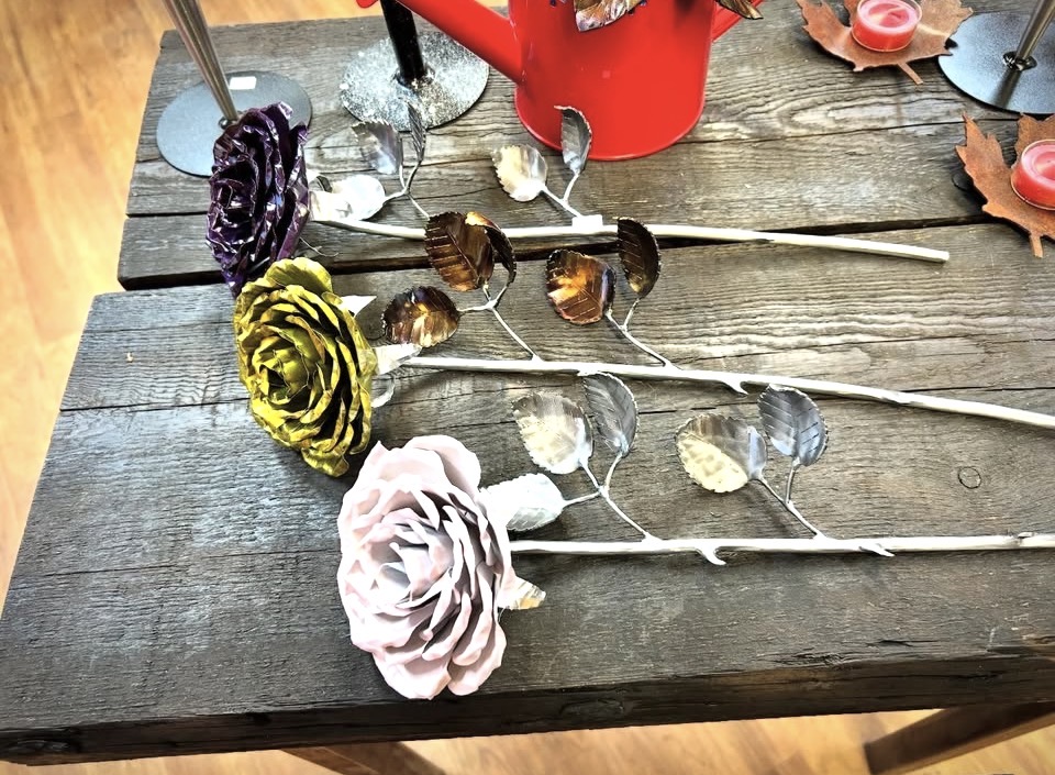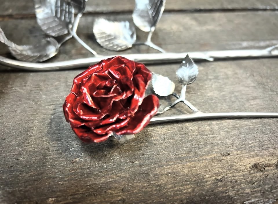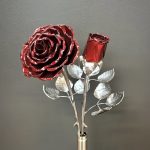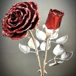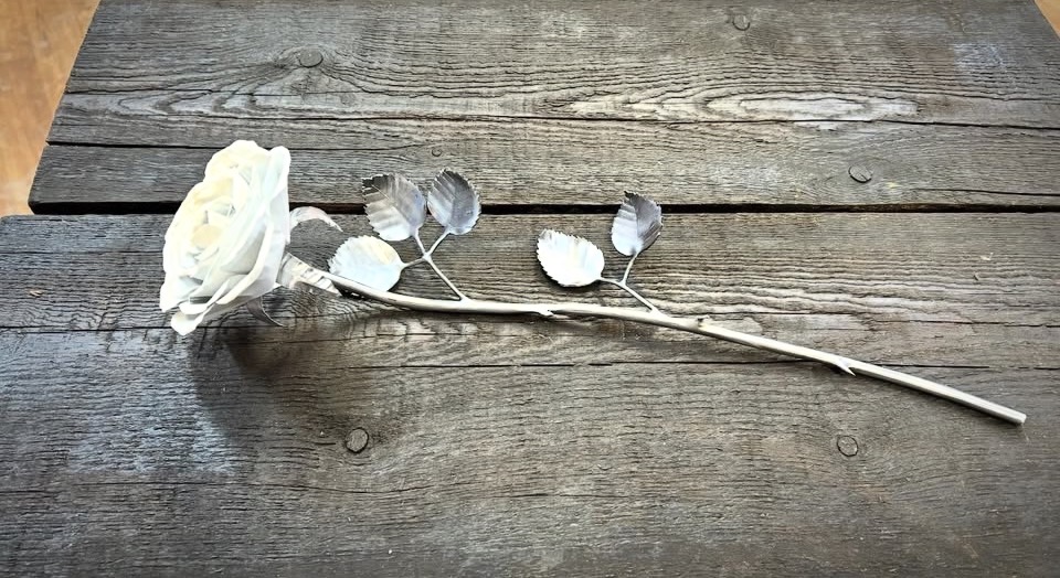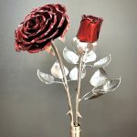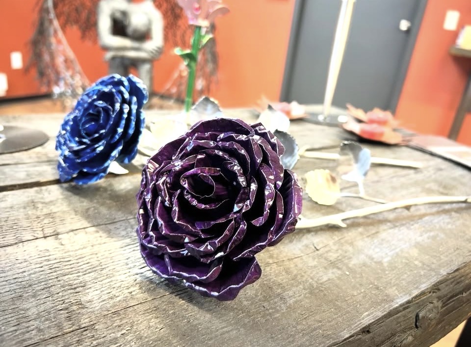 These roses are created from aluminum . Each layer individually primed and painted. Attached to steel stem and leaves .Set in a stainless steel “vase” for elegant display, on a burnt wood frame or simple laying on a surface display.