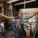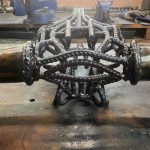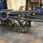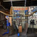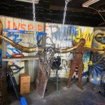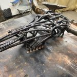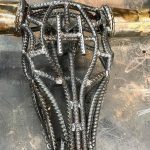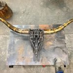 This is a pair of Texas long horn skulls I created for 2 separate clients. Skulls made from rebar, grade 8 bolt thread teeth. Horns made from a 3/16 rod formed cage wrapped with 16 gauge sheet metal. Coloured with a polished rust patina . Center of the skull containing the brand.