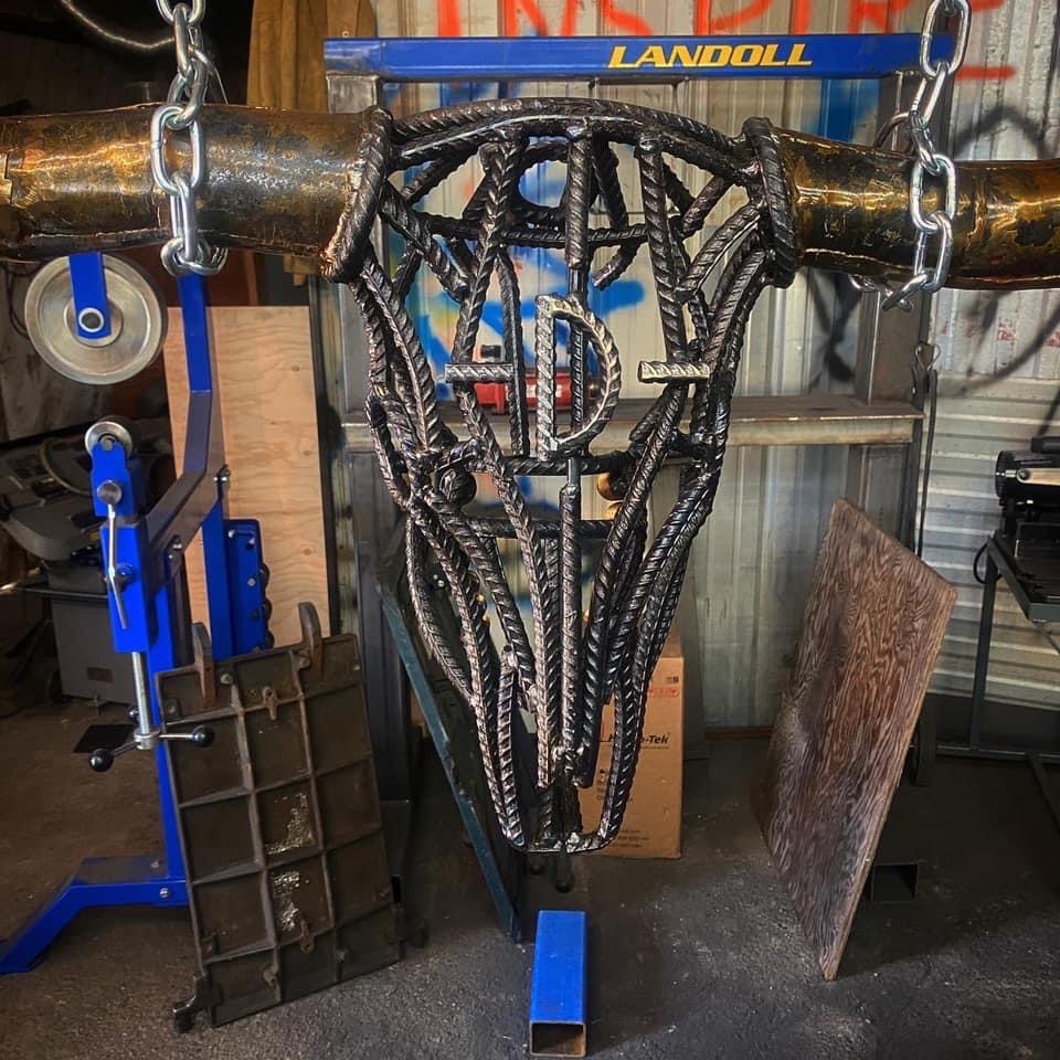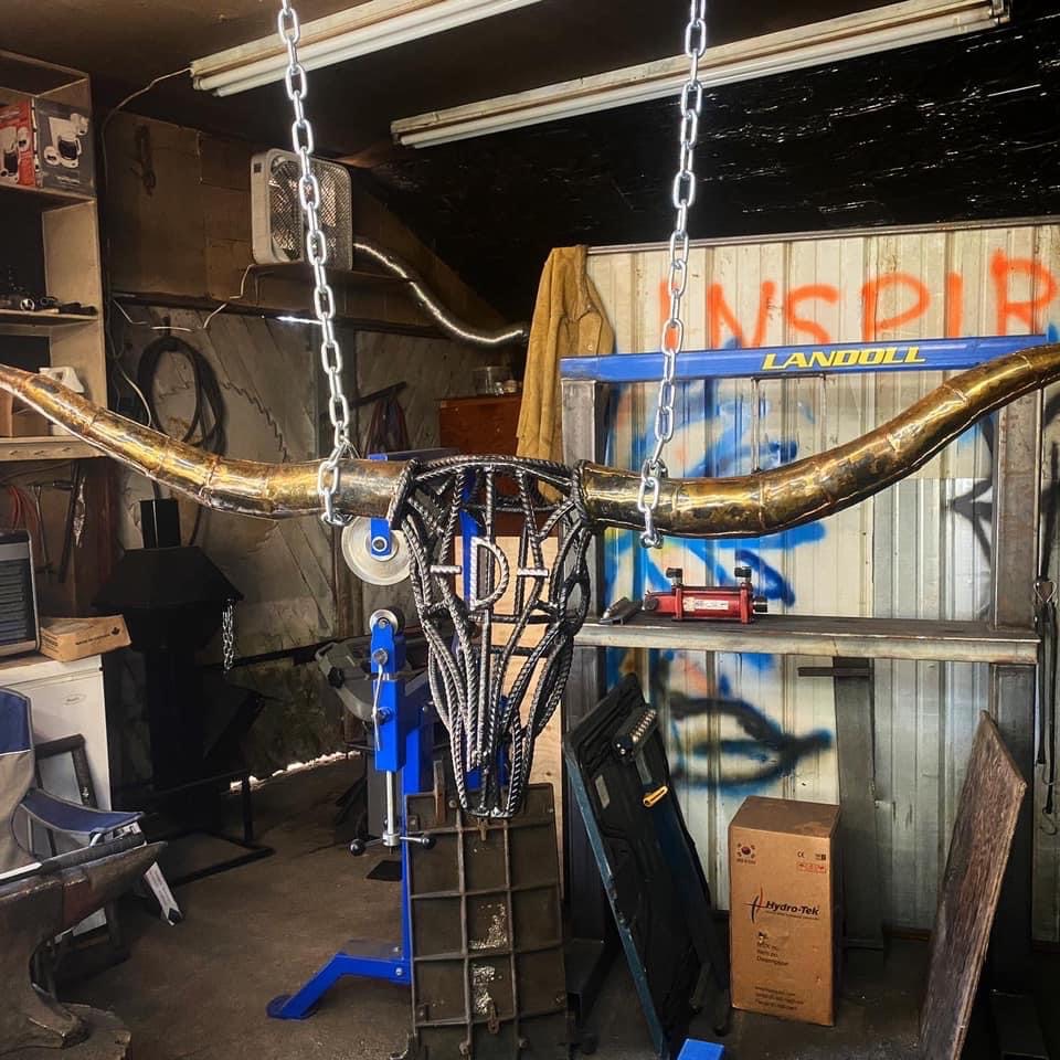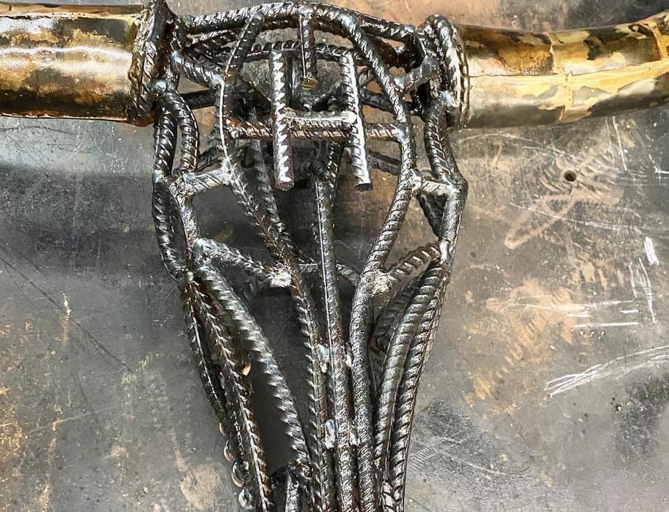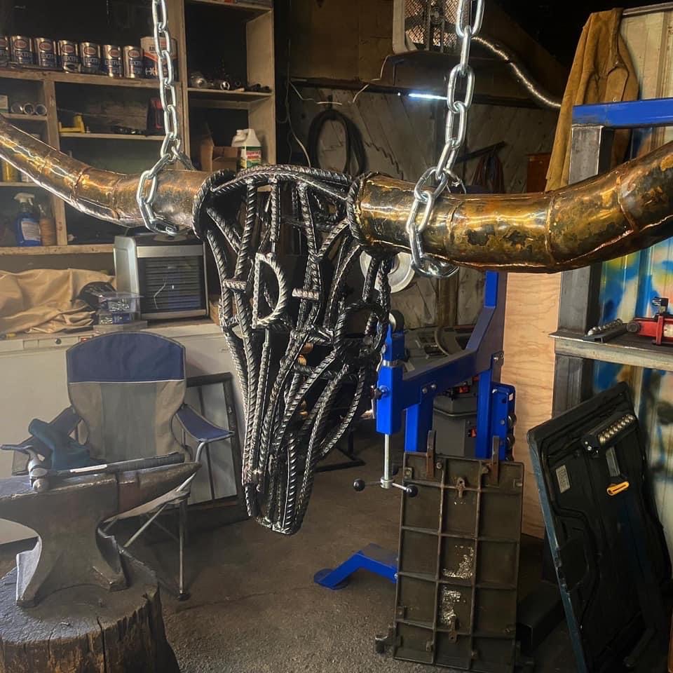 This is a pair of Texas long horn skulls I created for 2 separate clients. Skulls made from rebar, grade 8 bolt thread teeth. Horns made from a 3/16 rod formed cage wrapped with 16 gauge sheet metal. Coloured with a polished rust patina . Center of the skull containing the brand.