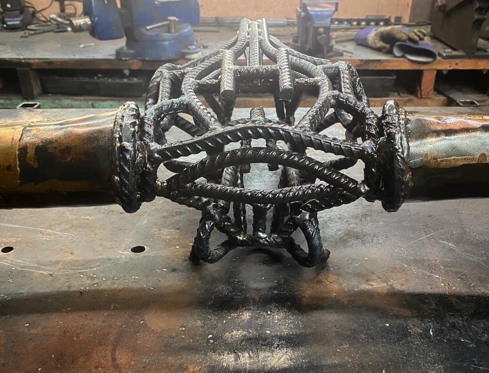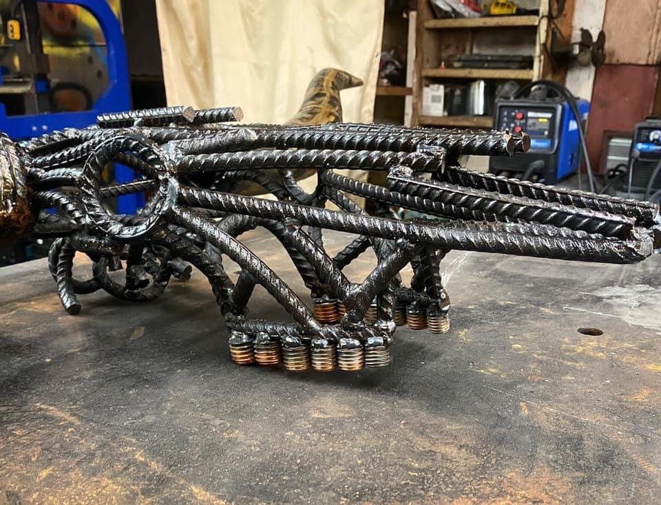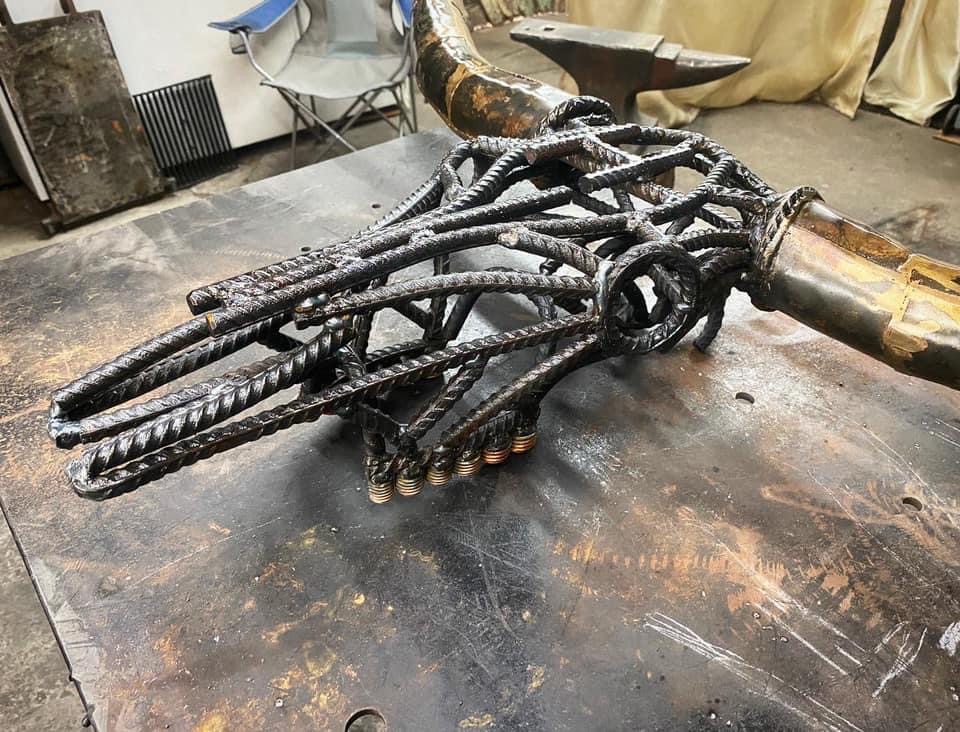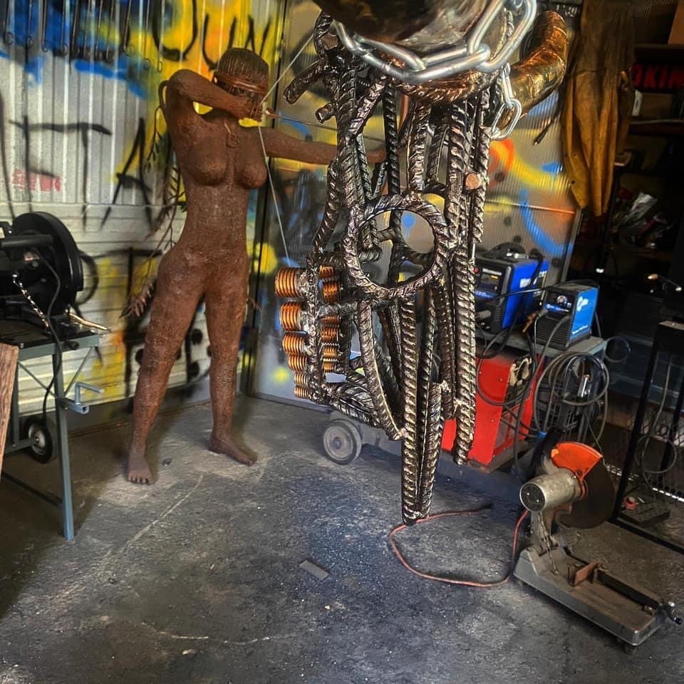 This is a pair of Texas long horn skulls I created for 2 separate clients. Skulls made from rebar, grade 8 bolt thread teeth. Horns made from a 3/16 rod formed cage wrapped with 16 gauge sheet metal. Coloured with a polished rust patina . Center of the skull containing the brand.