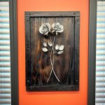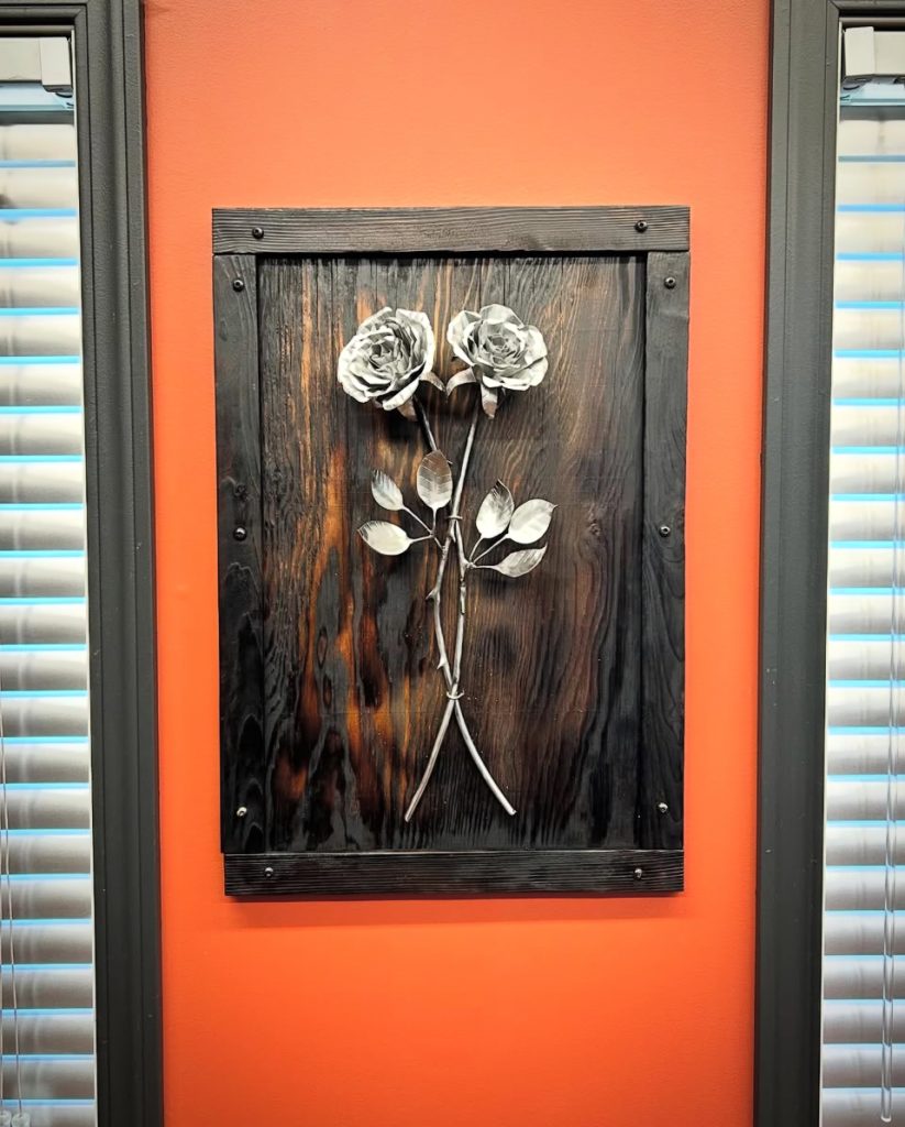 Wall rose sculpture on a burnt wood backing